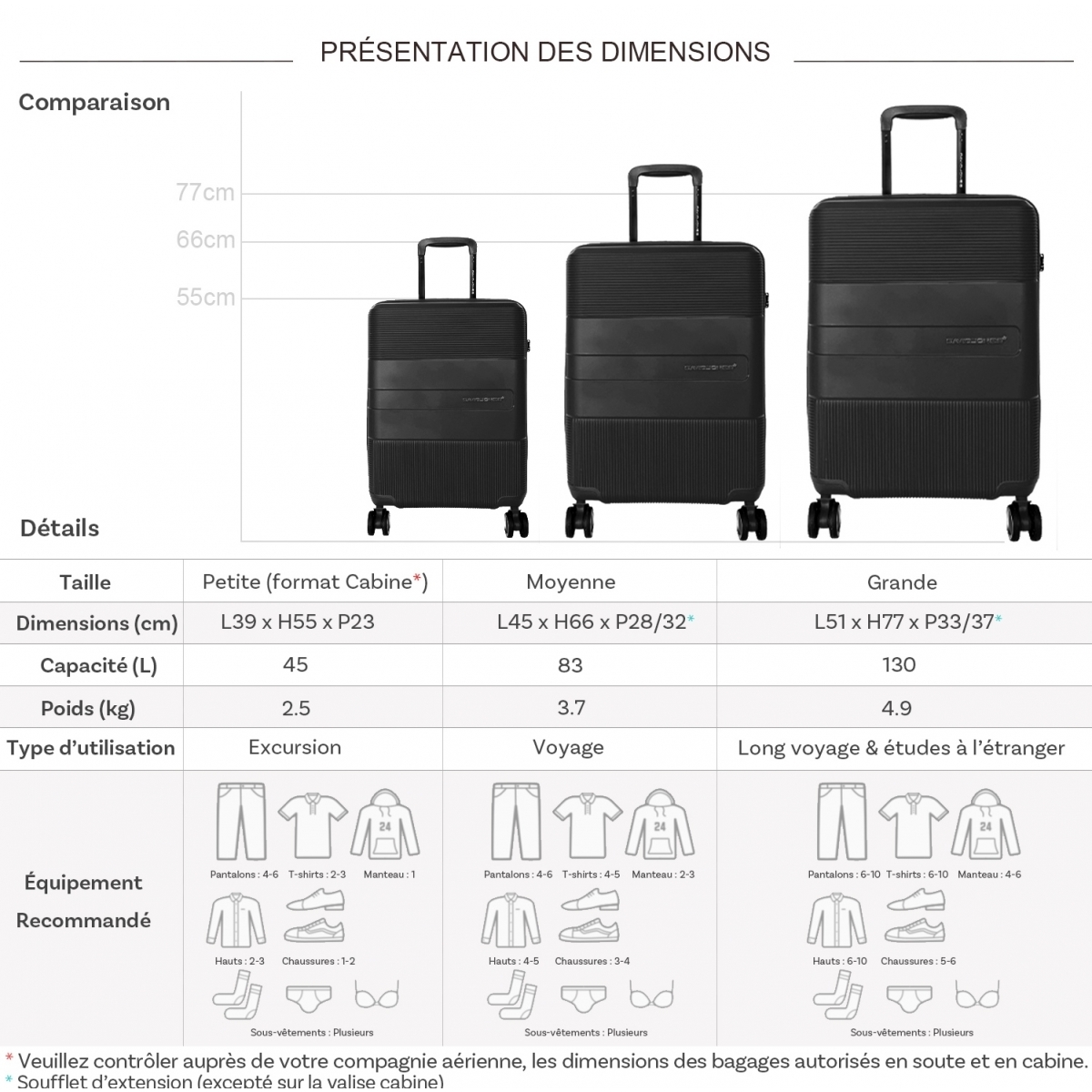 Les dimensions indiquées sont les dimensions extérieures des bagages, comprenant poignées, roulettes, pieds, poches latérales et autres éléments extérieurs.