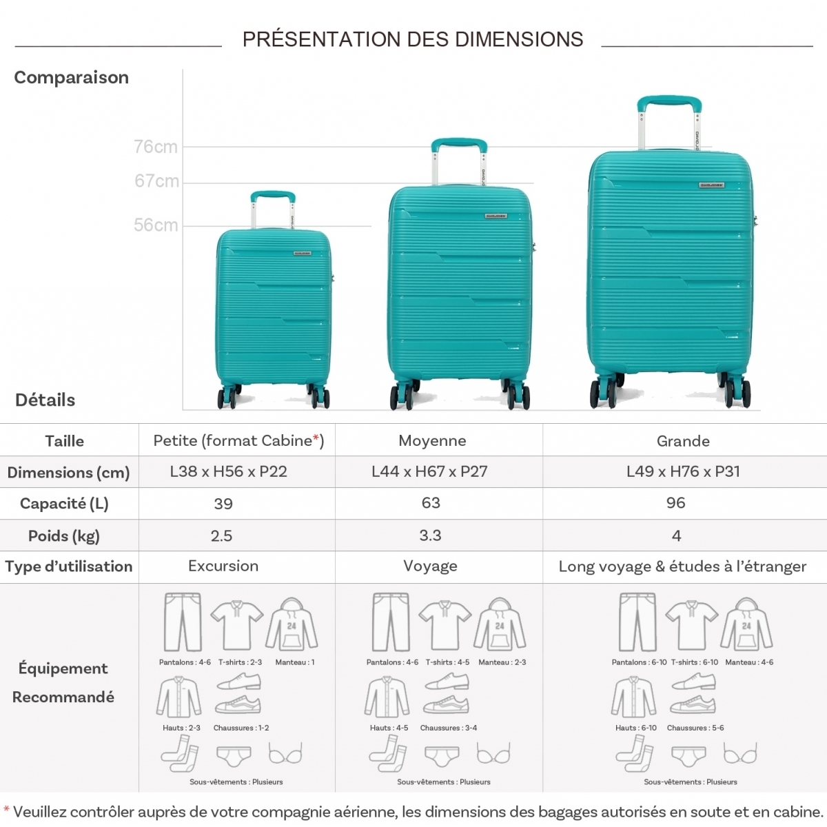Les dimensions indiquées sont les dimensions extérieures des bagages, comprenant poignées, roulettes, pieds, poches latérales et autres éléments extérieurs.