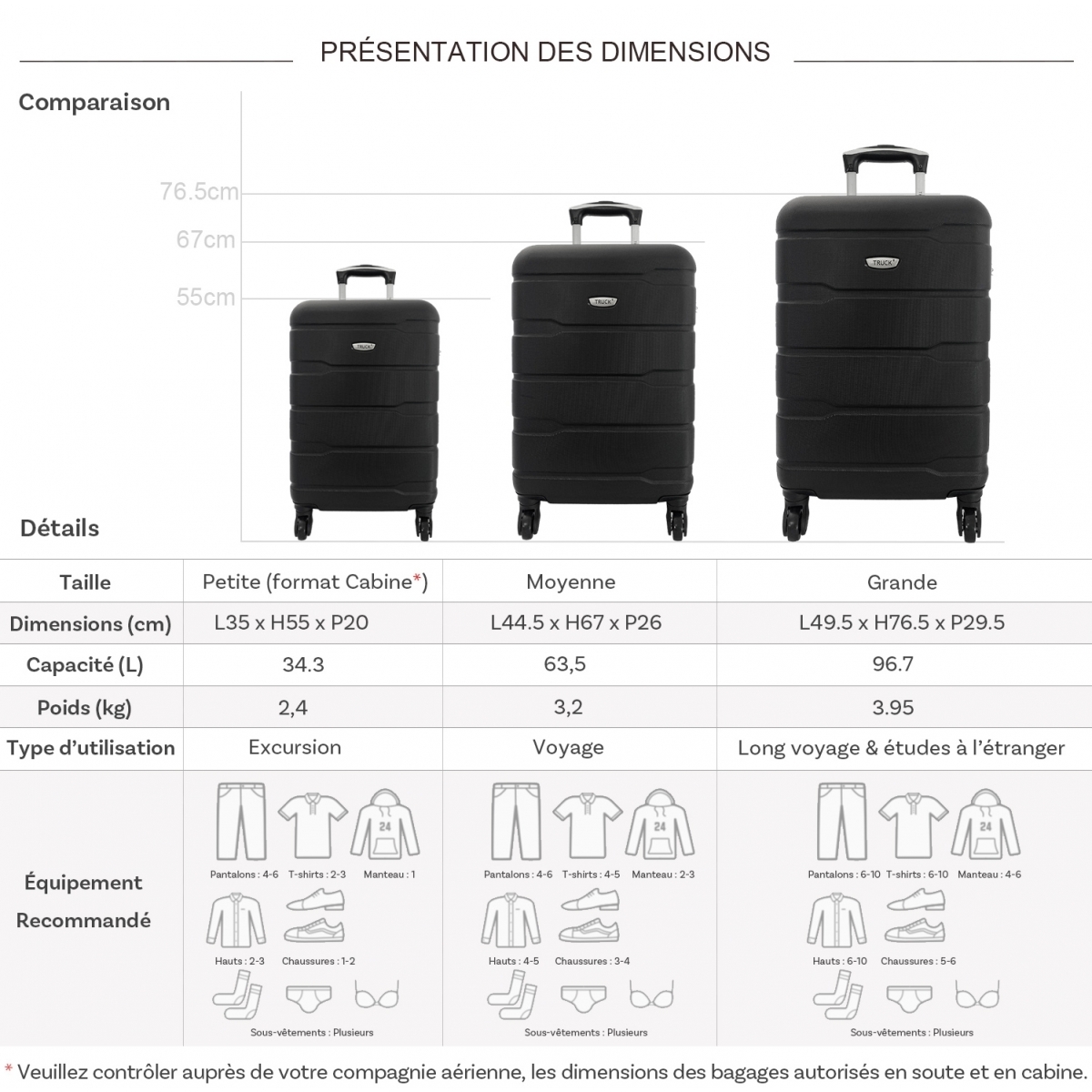 Les dimensions indiquées sont les dimensions extérieures des bagages, comprenant poignées, roulettes, pieds, poches latérales et autres éléments extérieurs.