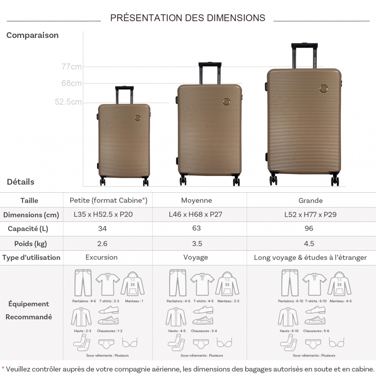 Les dimensions indiquées sont les dimensions extérieures des bagages, comprenant poignées, roulettes, pieds, poches latérales et autres éléments extérieurs.
