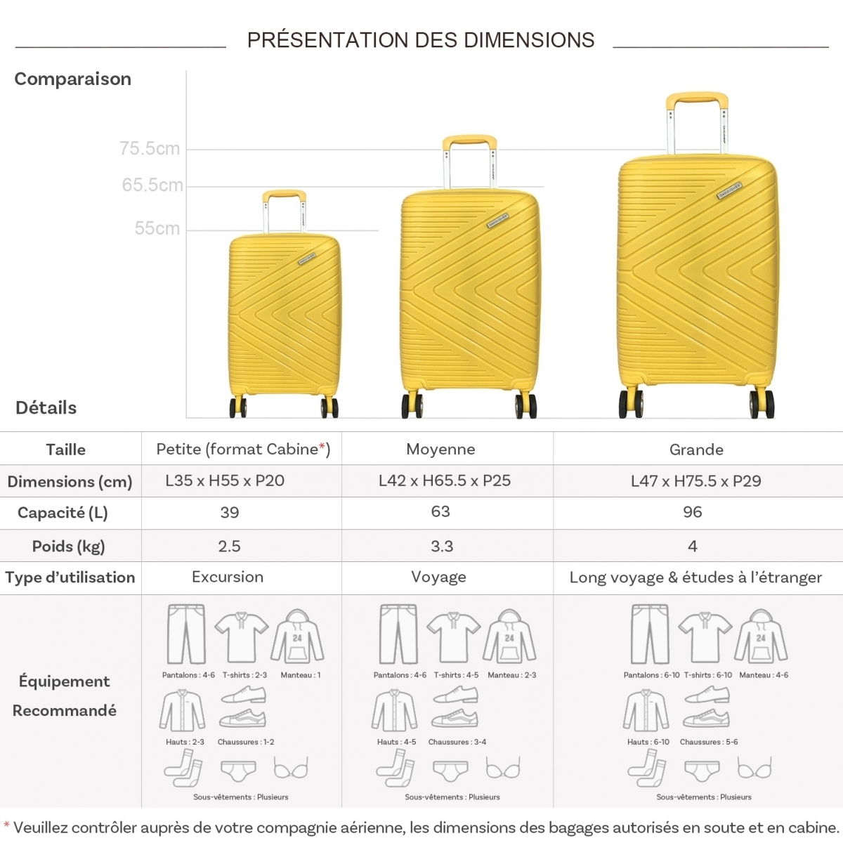 Les dimensions indiquées sont les dimensions extérieures des bagages, comprenant poignées, roulettes, pieds, poches latérales et autres éléments extérieurs.