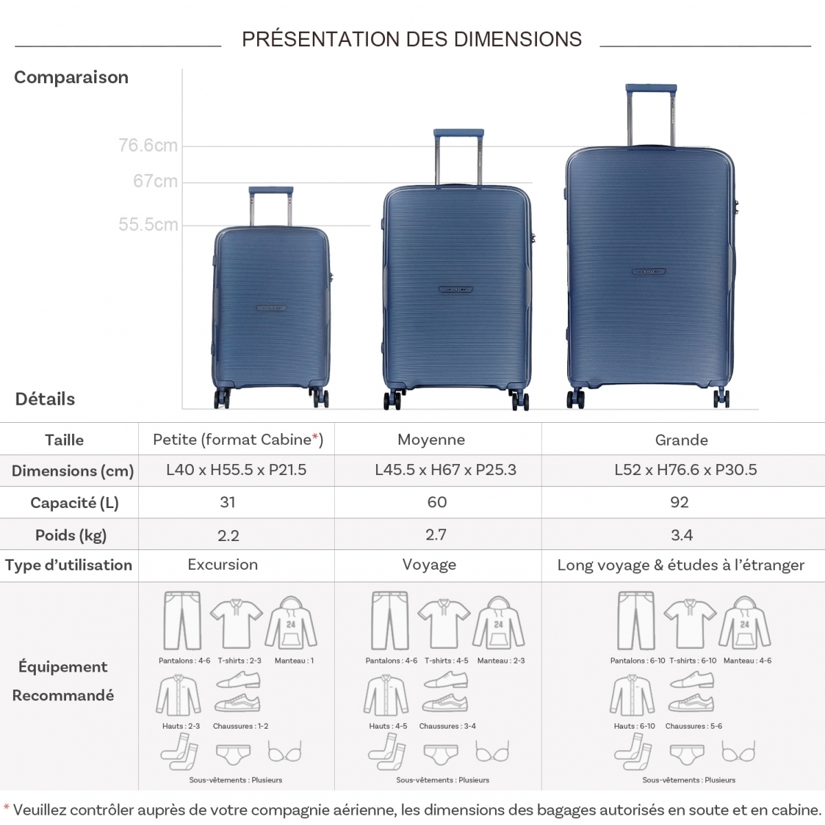 Les dimensions indiquées sont les dimensions extérieures des bagages, comprenant poignées, roulettes, pieds, poches latérales et autres éléments extérieurs.