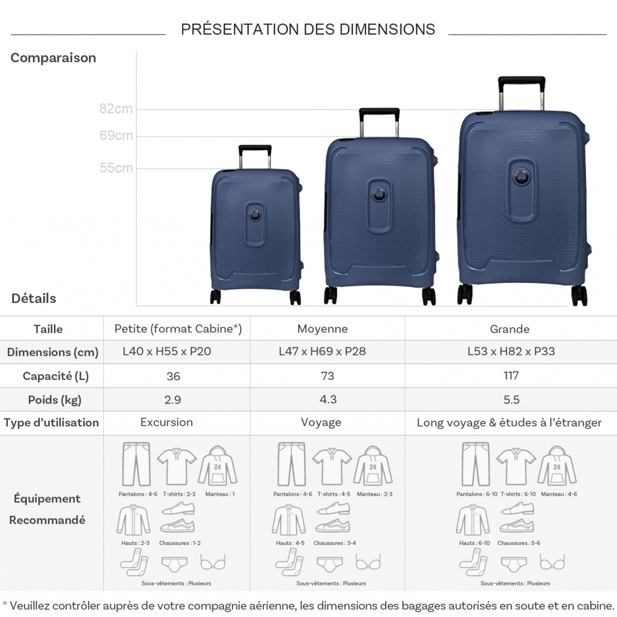 Les dimensions indiquées sont les dimensions extérieures des bagages, comprenant poignées, roulettes, pieds, poches latérales et autres éléments extérieurs.
