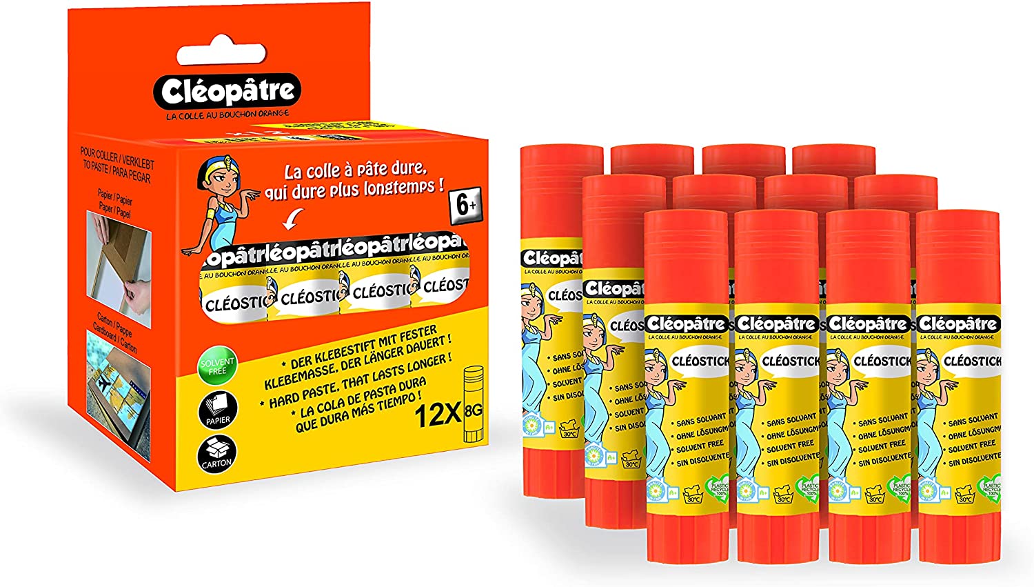 Lot de 12 bâtons de colle - 8g - Cléopâtre La colle Adhésive est une colle historique de Cléopâtre. La colle Cléopâtre est la colle référence pour tous les écoliers. Avec sa célèbre odeur d'amande, elle est incontournable. Elle permet de coller les papiers et cartons, elle est particulièrement résistante. De plus, elle se conserve longtemps et ne tâche pas les vêtements. Colle blanche sans solvant. Bâton de 8g. Corps et capuchon en plastique. Lot de 12 tubes de colle.