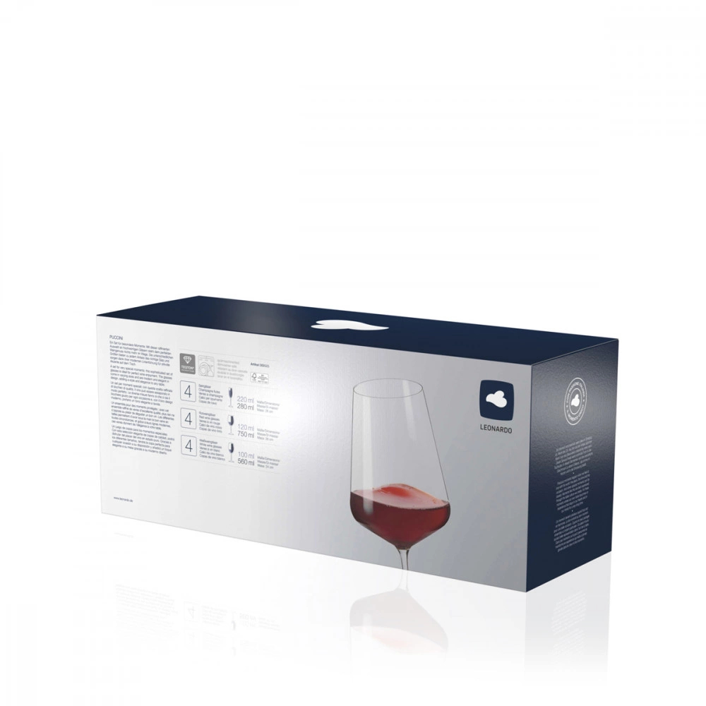 Lot de 4 coupes à champagne 280ml, 4 verres à vin rouge 750ml et 4 verres à vin blanc 560ml livré dans un boite cadeau. Simplicité du design pour une dégustation sobre. Matière : verre Dimensions boite : 65 x 22.5 x 27cm
