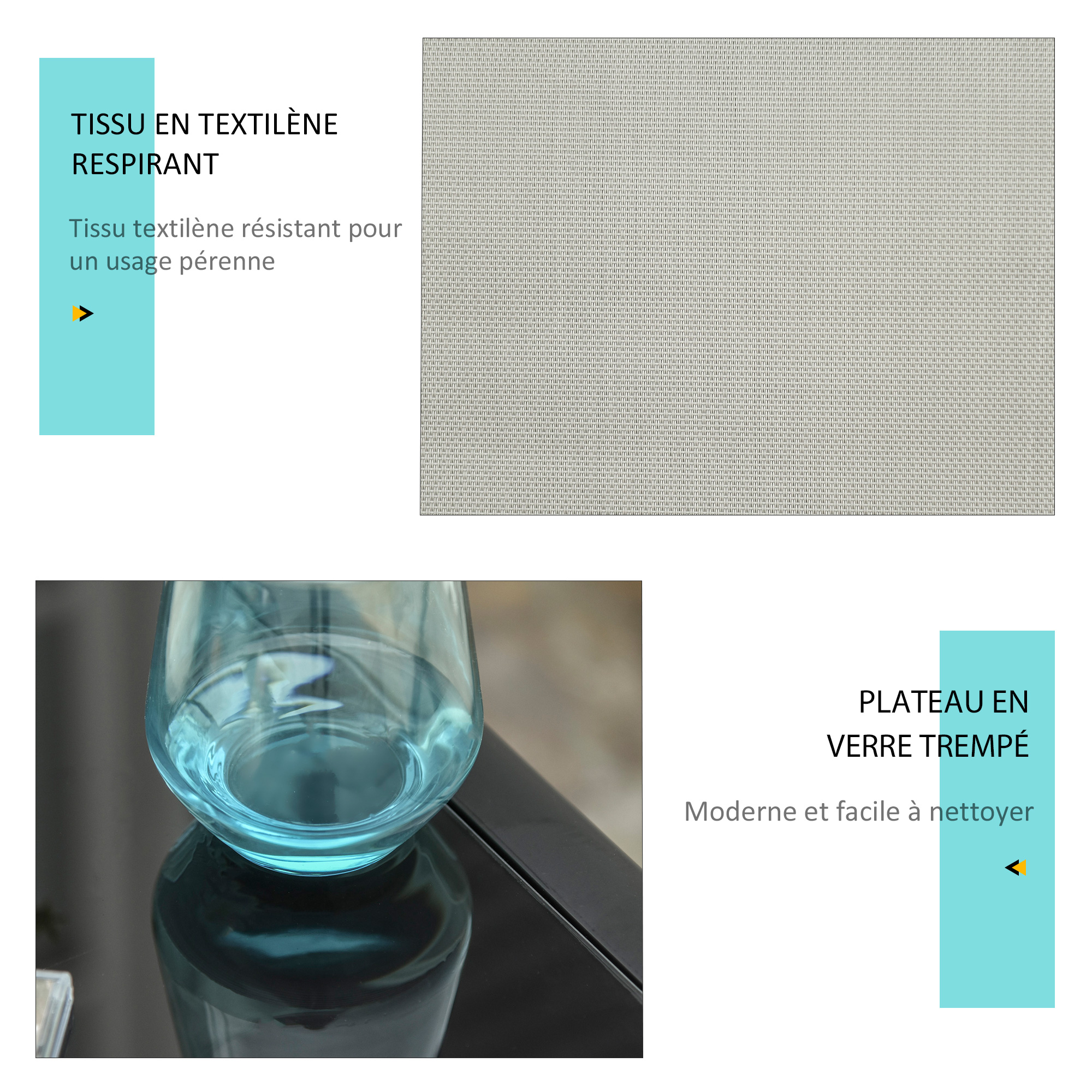 - Matériaux principaux : métal époxy anticorrosion, textilène, verre trempé