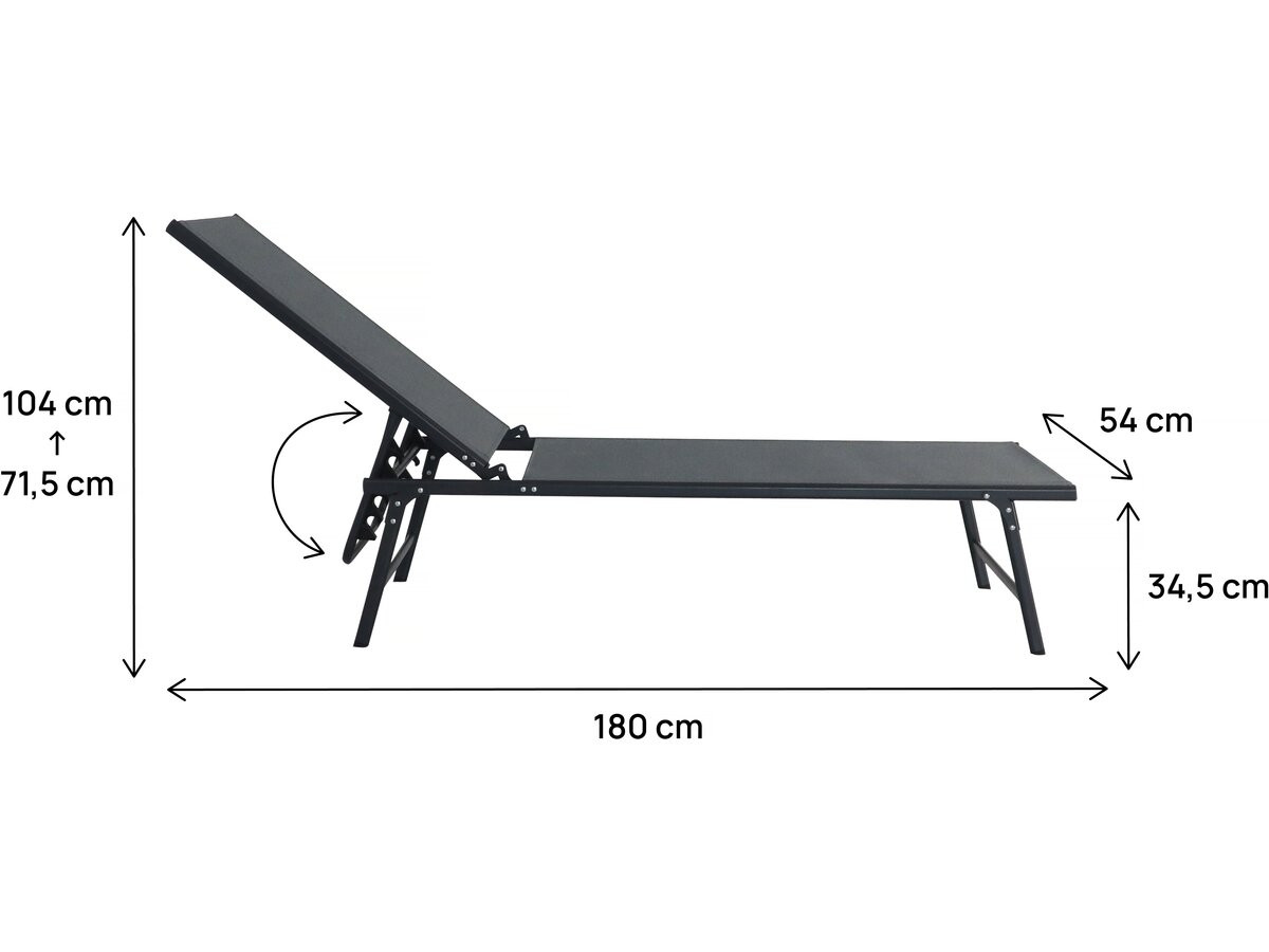 Lot de 2 bains de soleil en métal "Sublima" - 180 x 54 x 104 cm - AnthraciteProfitez pleinement des beaux jours avec ce lot de 2 bains de soleil "Sublima", au design élégant. Conçus pour allier confort et durabilité, ces transats sont parfaits pour aménager votre terrasse, balcon ou jardin.Avec leurs dimensions généreuses, 180 x 54 x 104 cm, ils offrent un espace de détente optimal. Leur structure en métal robuste assure une excellente stabilité, tandis que l'assise en textilène, avec son coloris anthracite, est parfaitement adaptée à une utilisation en extérieur..Les bains de soleil "Sublima" sont dotés de 4 positions d'inclinaison, vous permettant de choisir facilement votre angle de relaxation, que ce soit pour lire, bronzer ou faire une sieste. La hauteur du dossier est réglable de 71,5 à 104 cm, et la hauteur d'assise de 34,5 cm permet une installation facile.Craquez pour ces bains de soleil confortables et stylés, parfaits pour profiter pleinement du soleil tout l'été ! Bain de soleil "Sublima - Lot de 2 - Dimensions : 180 x 54 x 104 cm - Hauteur réglable : 71.5/ 104 cm - Hauteur d'assise : 34.5 cm - 4 inclinaisons - Métal/textilène - Anthracite .Descriptif: Bain de soleil Sublima - Lot de 2 - Dimensions : 180 x 54 x 104 cm - Hauteur réglable : 71.5/ 104 cm - Hauteur d'assise : 34.5 cm - 4 inclinaisons - Métal/textilène - Anthracite