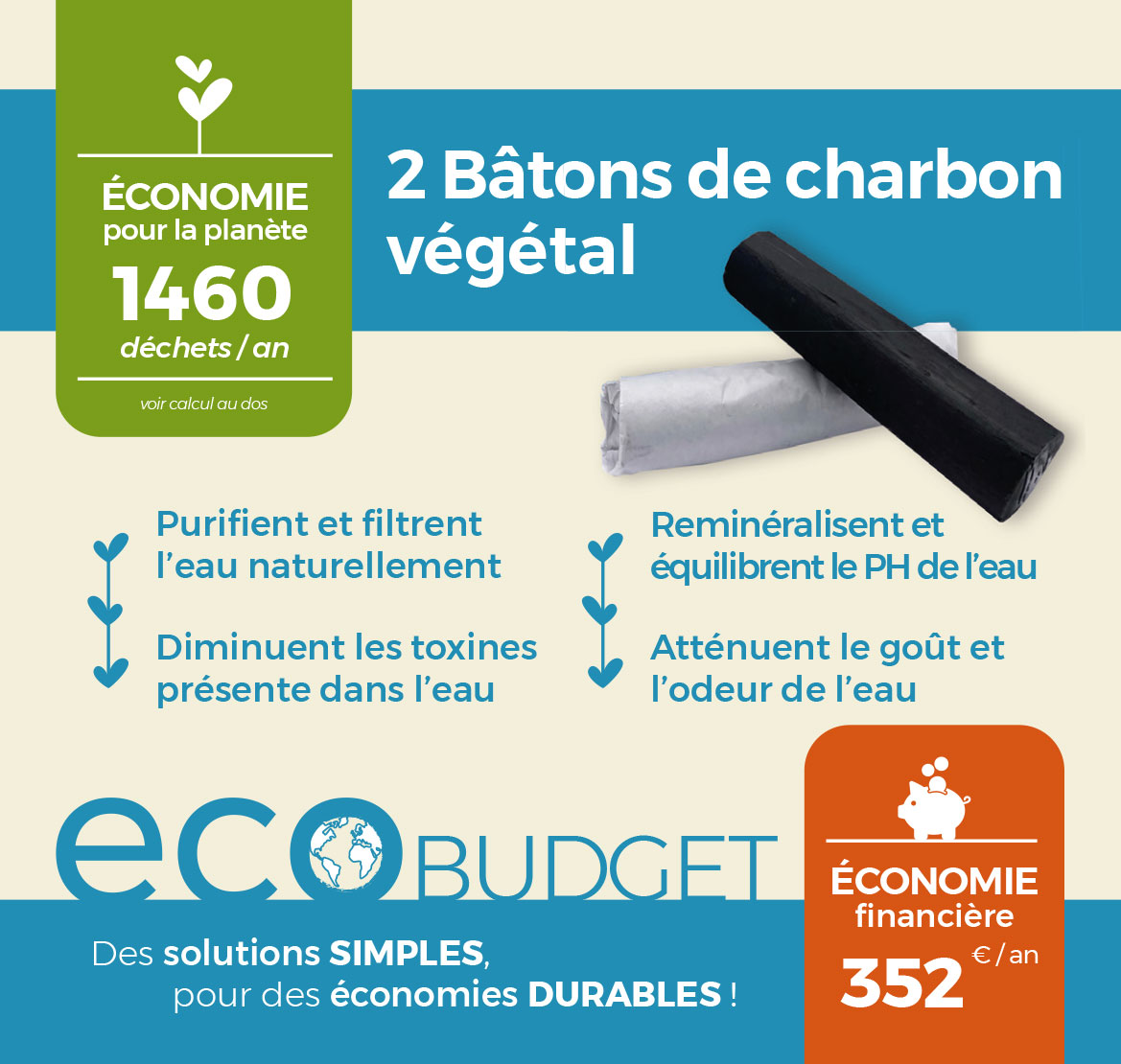 Les ECO-BUDGET Nous avons décidé de créer une nouvelle famille de produits qui permettent de «faire de l’écologie» par les économies d’énergie. Dans cette nouvelle catégorie un tableau précisera les économies financières et l’impact bénéfique pour la planète quant à l’utilisation de notre solution. L'ensemble de cette gamme permet d'économiser 1268.00€ par An pour une famille de 4 personnes et 31 KG de déchets Stop les achats de bouteilles en plastiques polluantes Filtrer sans carafe, c’est possible ! 100% végétal - 100% naturel - 100% biodégradable Diminue les toxines (chlore, pesticides, métaux lourds...) contenues dans l’eau courante. Reminéralise (calcium, potassium et acide silicique), Equilibre le PH de l’eau. Atténue son goût et son odeur, parfois désagréables. Purification de l’eau courante du robinet mais aussi de l’air. Carbonisation à 900 °C pendant 72 h. Méthode de pyrolyse traditionnelle et naturelle : sous terre, «combustion à l’étouffée» dans des meules de bois. Label : PEFC* *Certifie la protection et la gestion durable des forêts à travers le monde. Bois : Hêtre, Frêne, Charme 1. Préalablement faire bouillir le bâton pendant 10 min. Bien laisser sécher à l’air libre. 2. Plonger 1 bâton dans 1 Litre d’eau courante dans un contenant (carafe, gourde...). 3. Laisser agir entre 5h et 10h. 4. Consommer. 5. Le bâton peut rester dans l’eau pendant 1 à 3 mois. Au-delà, le refaire bouillir 10 min pour le purifier avant de le réutiliser. (vider ses pores des particules toxiques accumulées pendant son immersion dans l’eau). 6. Durée de vie : 3 à 6 mois selon la qualité de l’eau. 7. Recycler comme fertilisant pour plantes ou dans le composteur ou dans la litière pour chat. Dimensions du charbon seul Longueur : (+/-) 10 cm Poids : (+/-) 26 g Ø : (+/-) 2 cm Les dimensions peuvent varier en fonction des bâtons. Dimensions du présentoir : L 27 x P 18 x H 28 cm Non déplié : L 27 x P 18 x H 14 cm Economies estimées à 352.00€ / An pour une famille de 4 personnes Ce calcul des économies est à titre informatif et est réalisé en interne par Eco-conseils.