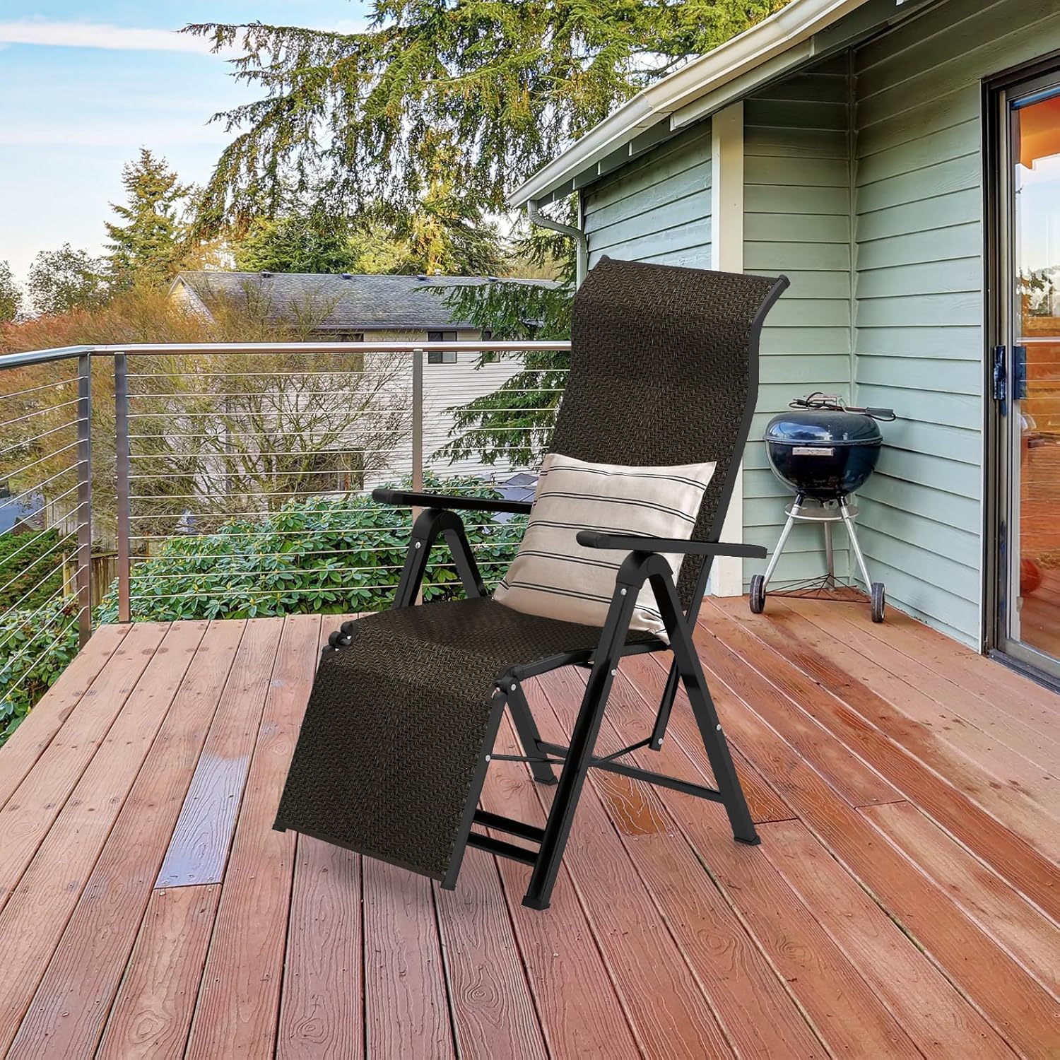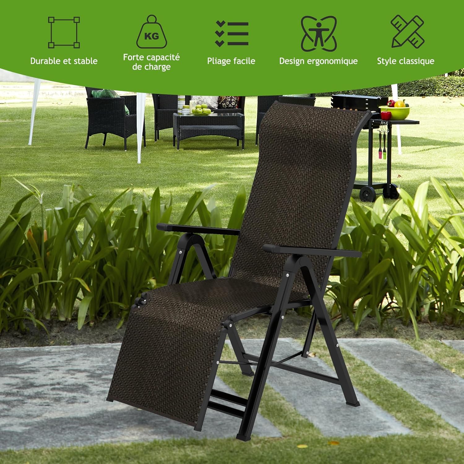 Notre chaise longue de patio est fabriquée en rotin PE de qualité supérieure, rendant le siège plus respirant afin d’offrir une assise confortable en plein air. Le cadre en métal solide permet une capacité portante de 150 kg, et le design ajustable en 10 positions du dossier et du repose-pied vous permet de trouver l’angle d’inclinaison et la hauteur souhaitée. Ce fauteuil d’extérieur peut être plié dans une taille compacte et rangé dans le placard ou le coffre de la voiture, facilitant considérablement son stockage et déplacement. Il convient pour de divers endroits applicables, y compris le balcon, le jardin, la cour, la plage, etc. Venez l’acheter !