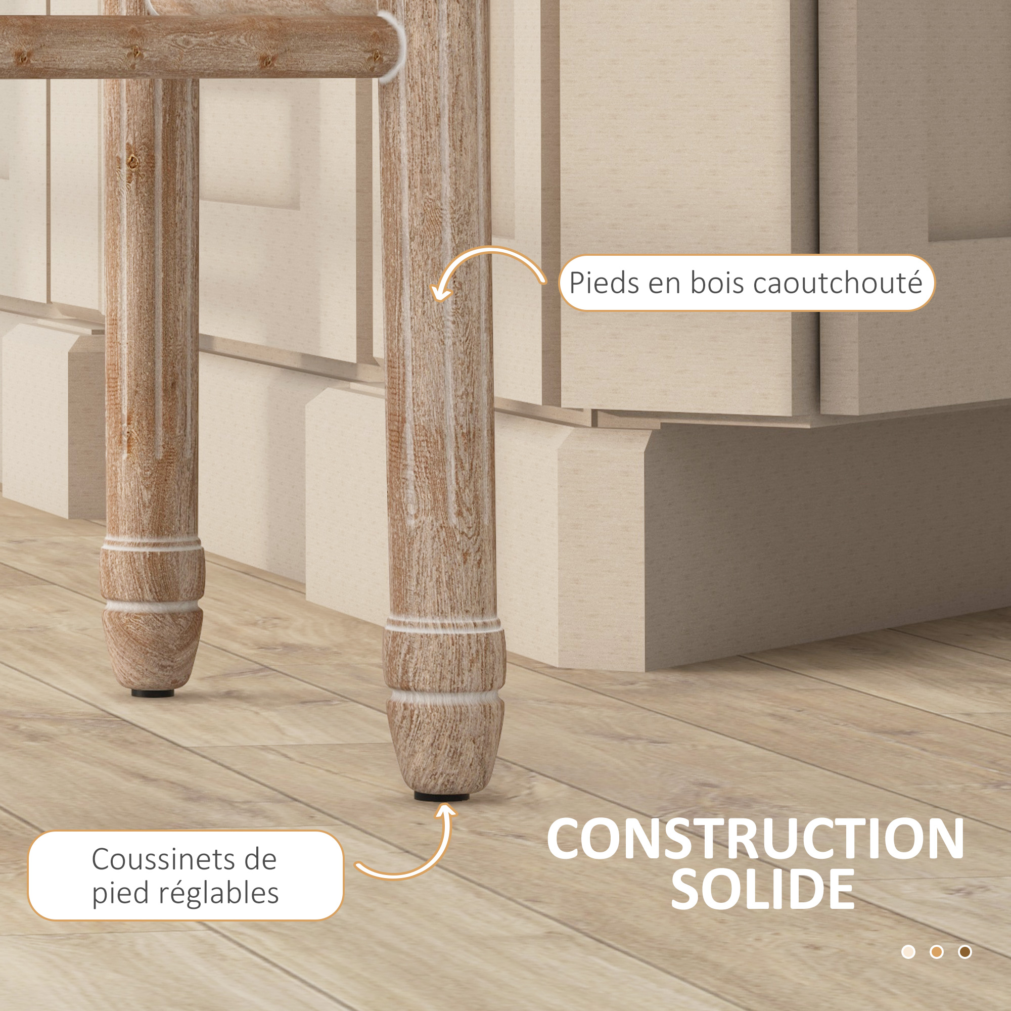 - Matériaux : tissu aspect lin (100 % polyester), rembourrage mousse, bois d'hévéa