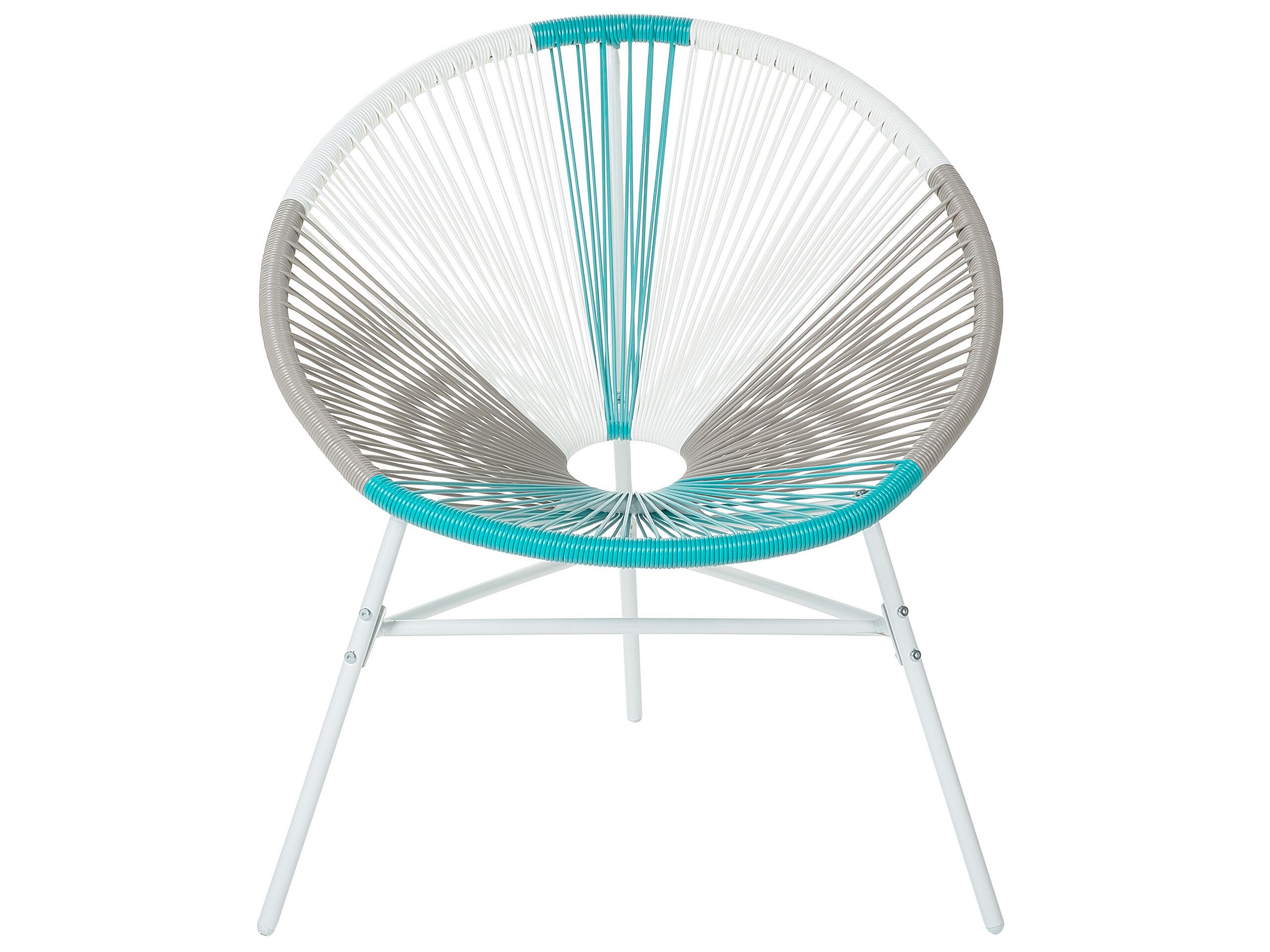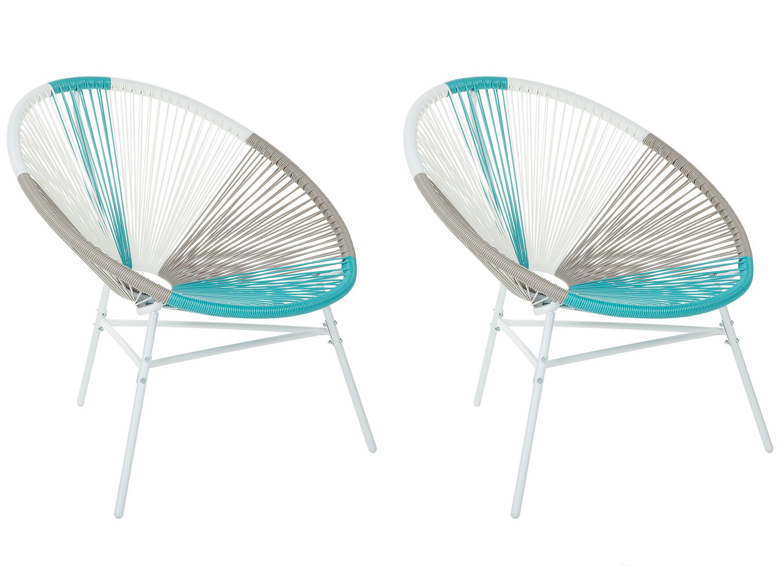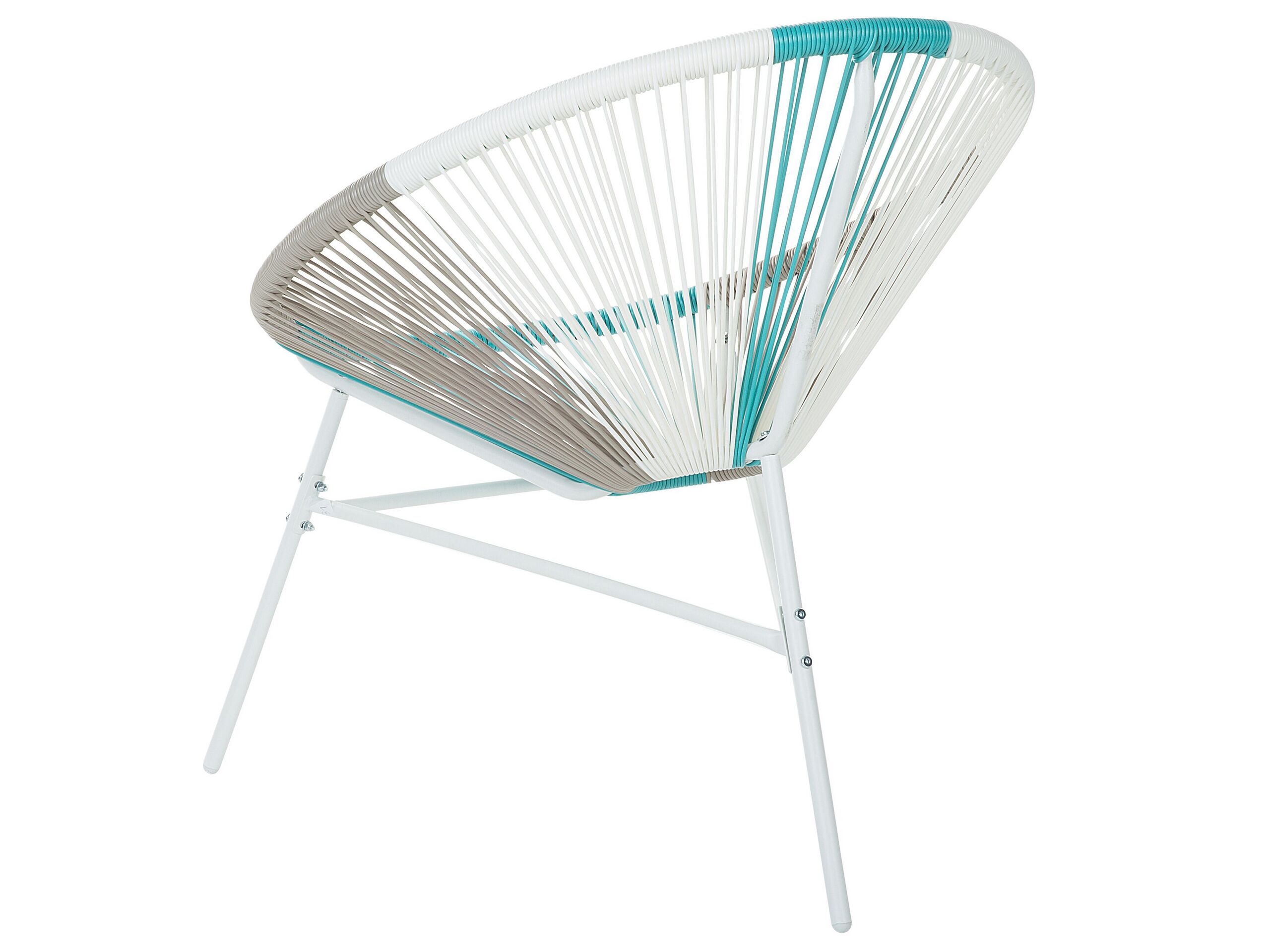 Fauteuils bas en polyrotin. Ce lot de deux chaises de jardin confortables et originales sont faites en rotin artificiel turquoise et blanc et d'une structure en acier blanc robuste. Sur ces chaises, vos chaudes journées d'été seront agréables. La conception inhabituelle du revêtement en forme de corde, donne un caractère aéré à ces chaises de jardin, adaptées pour tout style de terrasse, jardin ou même balcon. Les chaises sont des compagnons pratiques pour toutes les zones intérieures et extérieures, avec un rotin artificiel résistant à la chaleur et à la décoloration.Un ensemble idéal dans votre jardin !