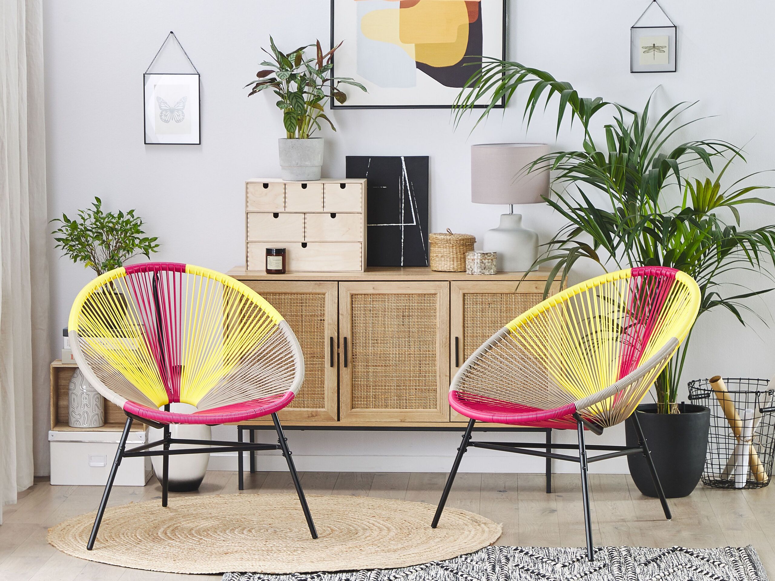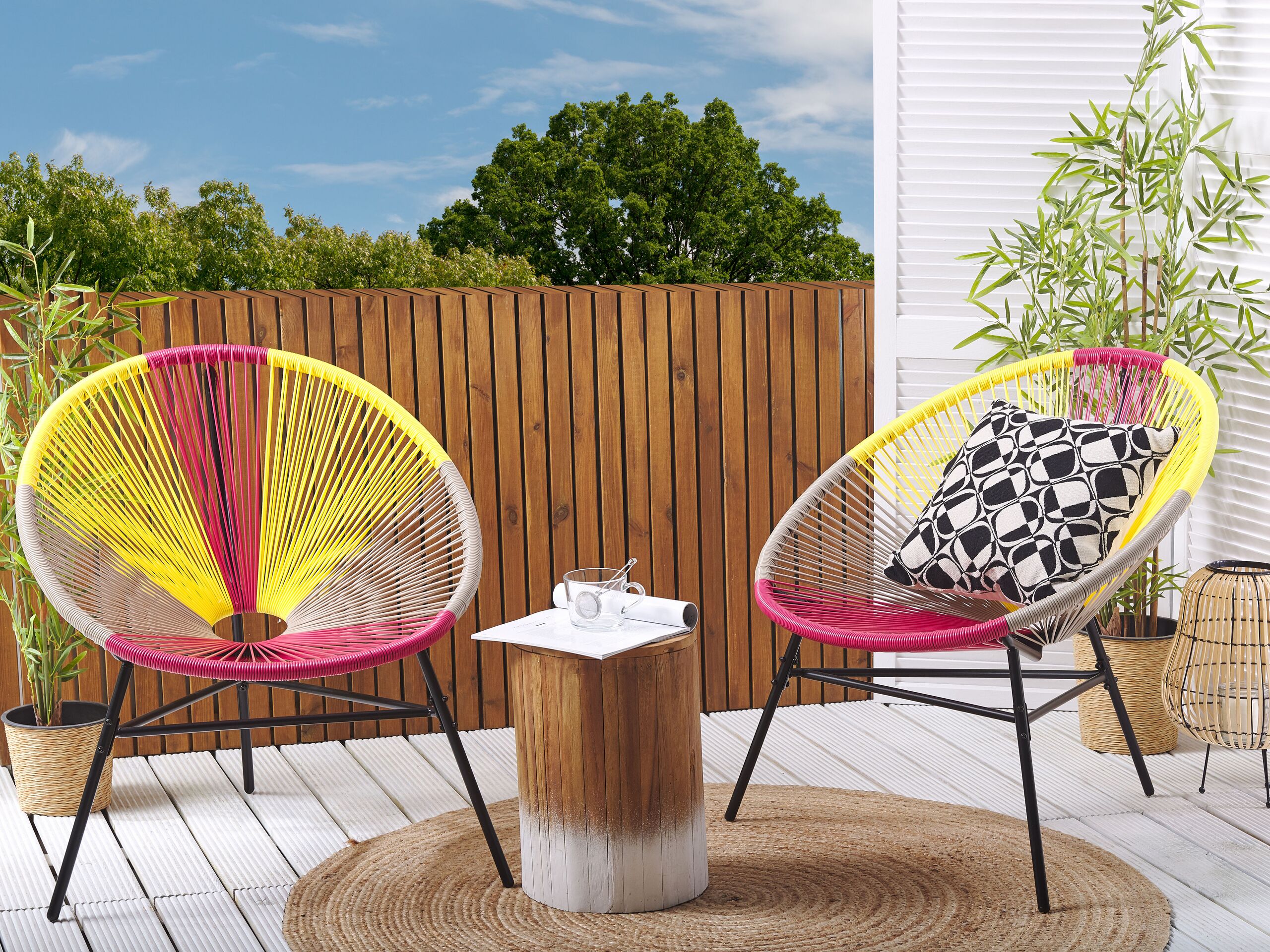 Fauteuil bas en polyrotin. Ce lot de deux chaises de jardin confortables et originales sont faites en rotin artificiel blanc, jaune et rose et d'une structure en acier noir robuste. Sur ces chaises, vos chaudes journées d'été seront agréables. La conception inhabituelle du revêtement en forme de corde donne un caractère aéré à ces chaises de jardin, adaptées pour tout style de terrasse, jardin ou même balcon. Les chaises sont des compagnons pratiques pour toutes les zones intérieures et extérieures, avec un rotin artificiel résistant à la chaleur et à la décoloration.