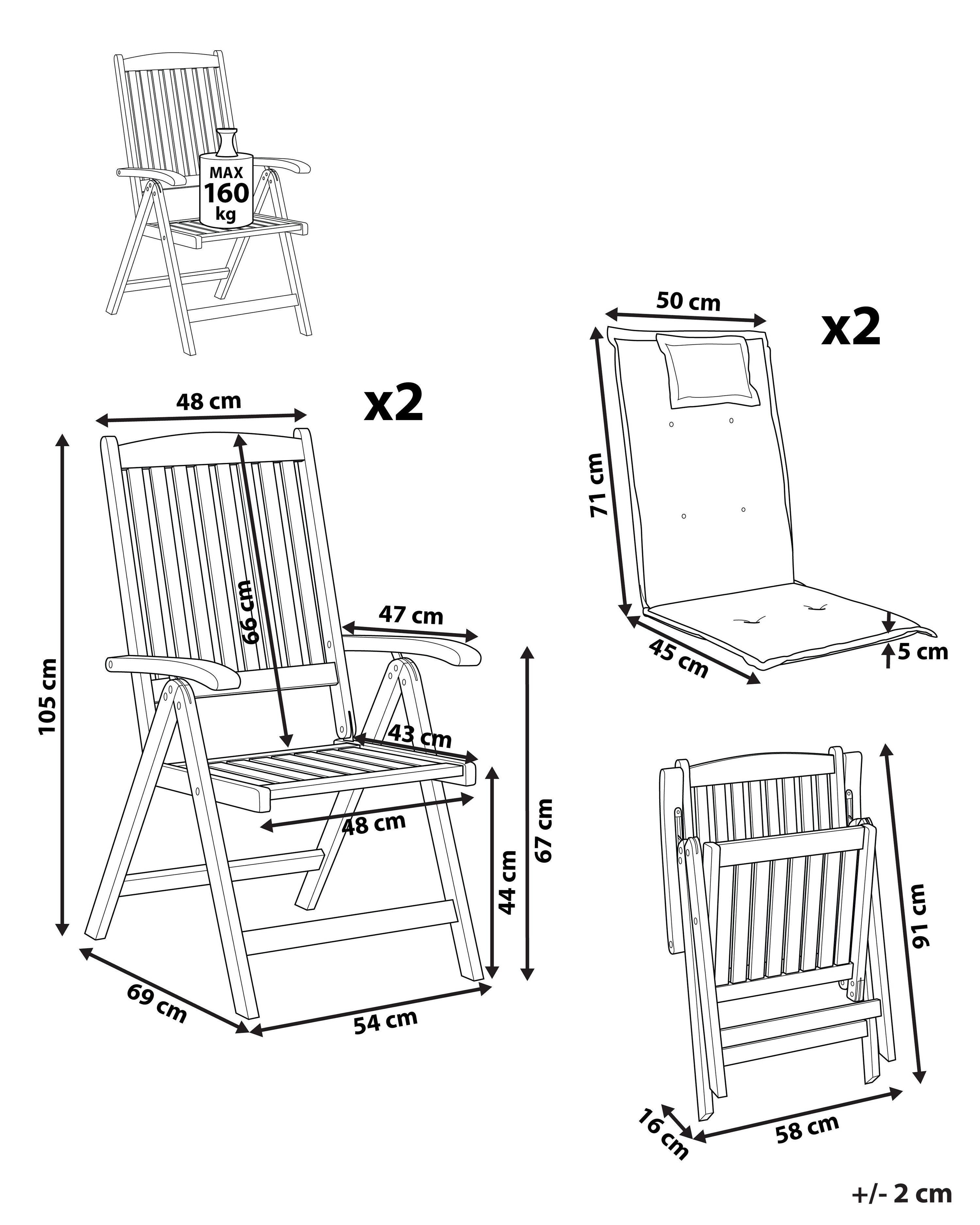 2 chaises réglables d'extérieur. Ajoutez une touche classique à votre espace extérieur avec ces chaises de jardin et leurs coussins. Elles sont fabriquées en bois d'acacia résistant aux UV et nécessitent peu d'entretien. Grâce à leur dossier réglable, vous pouvez choisir la meilleure position pour votre confort, et leur fonction pliante permet de les ranger sans effort.
