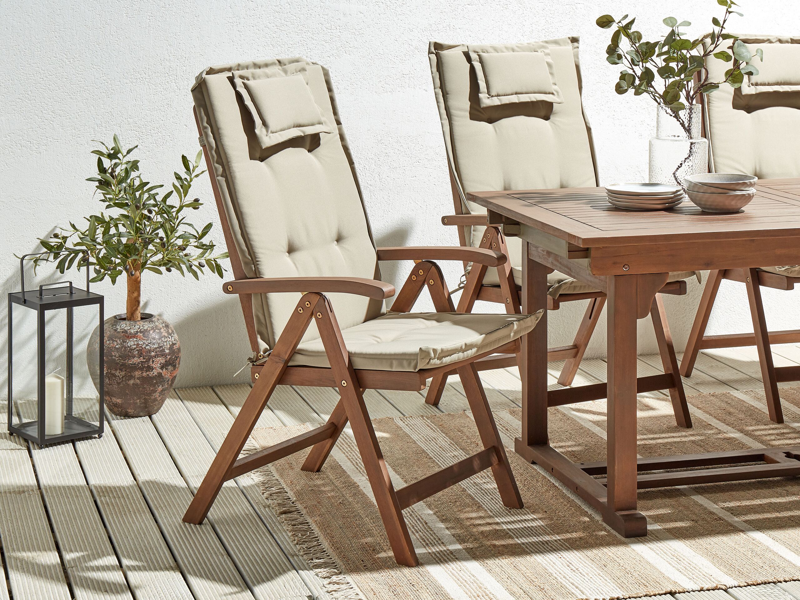 2 chaises réglables d'extérieur. Ajoutez une touche classique à votre espace extérieur avec ces chaises de jardin et leurs coussins. Elles sont fabriquées en bois d'acacia résistant aux UV et nécessitent peu d'entretien. Grâce à leur dossier réglable, vous pouvez choisir la meilleure position pour votre confort, et leur fonction pliante permet de les ranger sans effort.