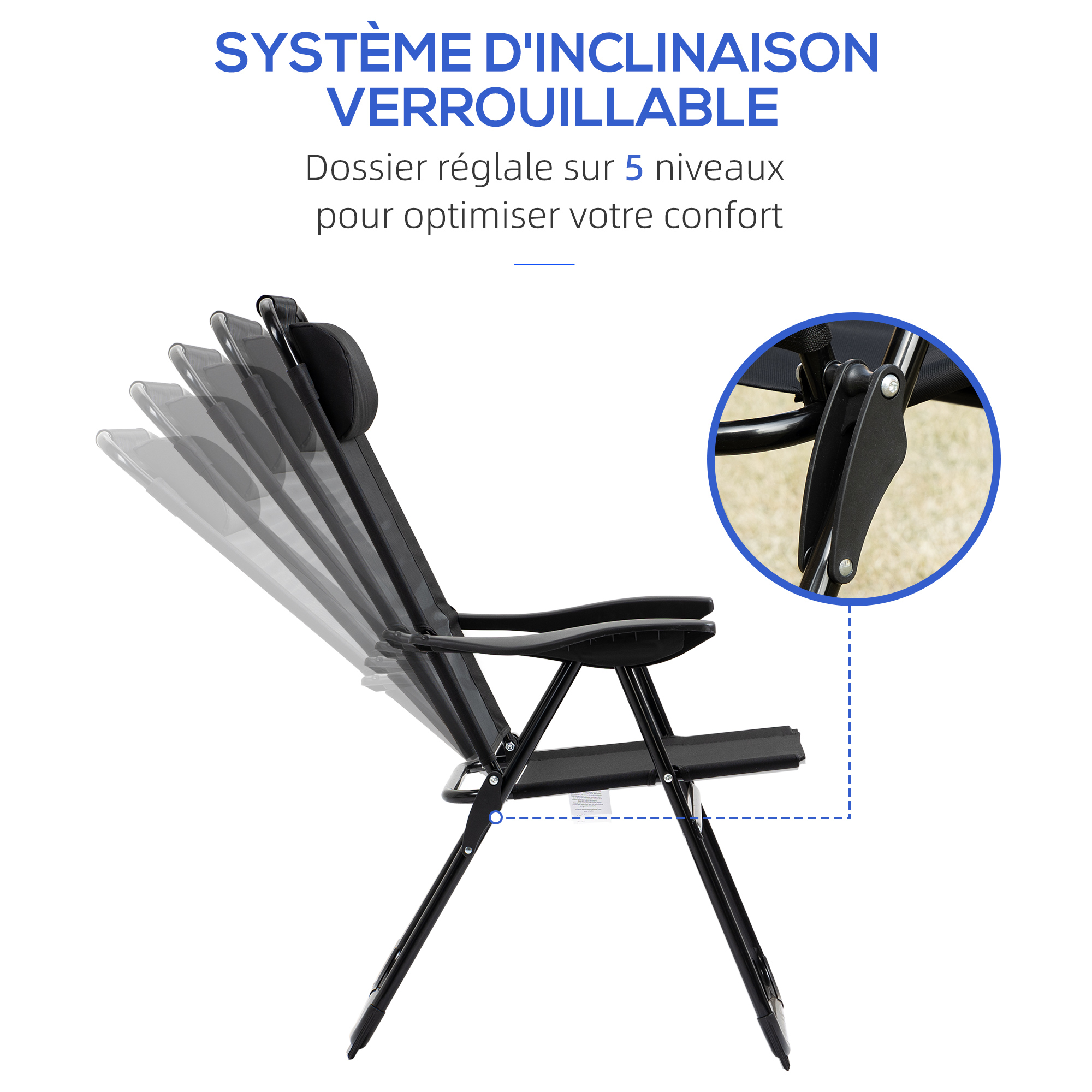 Lot de 2 chaises de jardin camping pliables - dossier inclinable 5 positions - tétière incluse - acier ép