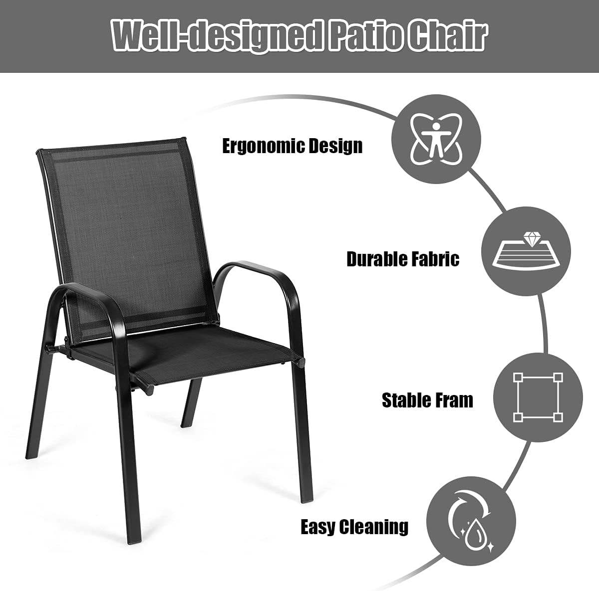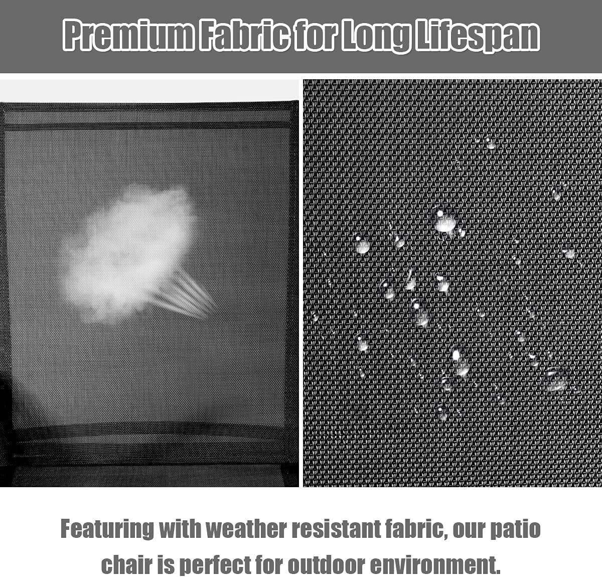 - Expérience de Siège Confortable : Fabriquée dans un tissu de qualité supérieure respirant, cette chaise d'extérieur ne vous laissera pas vous sentir étouffé même lors d'une chaude journée d'été. Les accoudoirs incurvés des deux côtés soulagent la pression sur vos épaules et vos bras et vous permettent de vous détendre totalement. De plus, le dossier haut peut bien soutenir votre colonne vertébrale dans une posture correcte.
