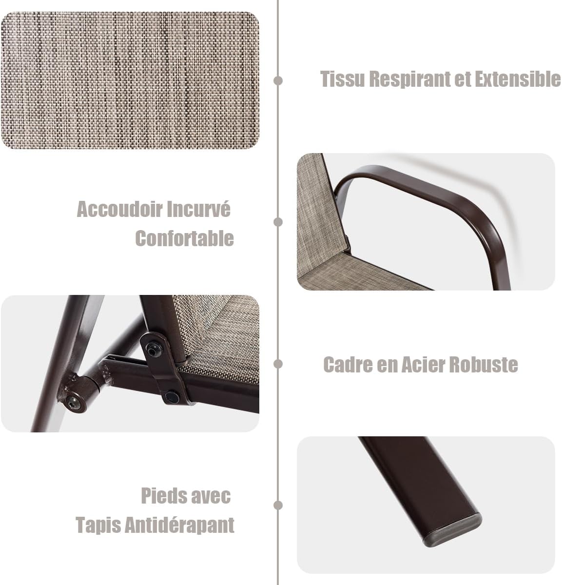 - Expérience de Siège Confortable : Fabriquée dans un tissu de qualité supérieure respirant, cette chaise d'extérieur ne vous laissera pas vous sentir étouffé même lors d'une chaude journée d'été. Les accoudoirs incurvés des deux côtés soulagent la pression sur vos épaules et vos bras et vous permettent de vous détendre totalement. De plus, le dossier haut peut bien soutenir votre colonne vertébrale dans une posture correcte.