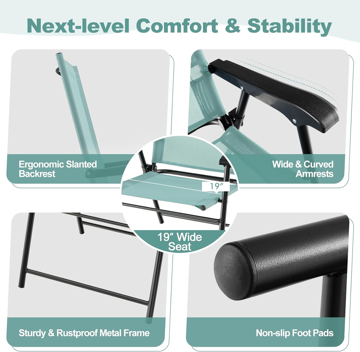 Avec un tissu d'assise durable et confortable, chaque chaise est respirante pour s'asseoir. Équipées d'un dossier confortable et d'accoudoirs, les chaises vous apporteront plus de confort. De plus, le cadre métallique robuste assure une grande stabilité et une forte capacité de poids. Les chaises sont pliantes pour un rangement et un transport faciles. Ces chaises conviennent à de nombreux scénarios, tels que le jardin, le porche avant, le camping, etc.