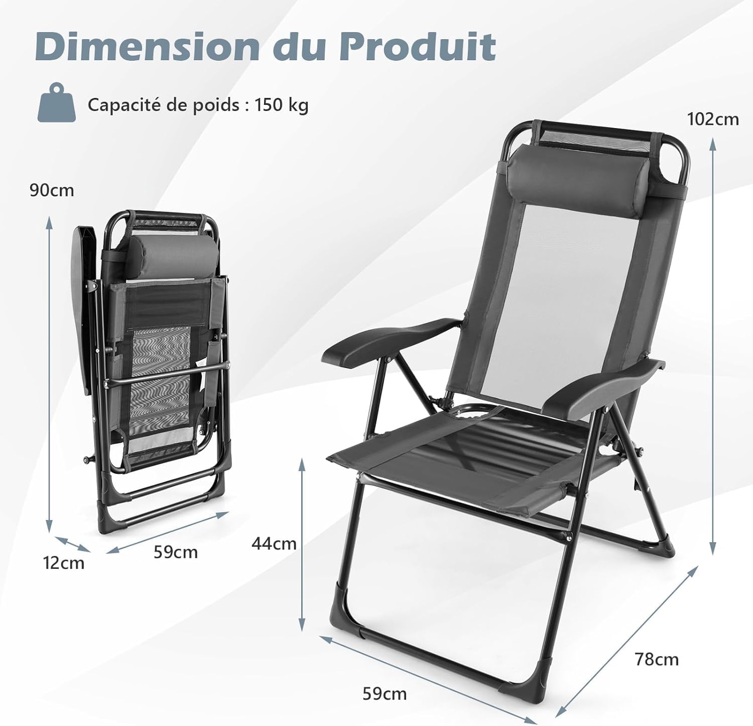 - Confort personnalisé: Avec notre chaise de jardin de haute qualité, vous pouvez profiter du luxe de la personnalisation. Le dossier peut être réglé en 7 positions pour vous offrir le soutien idéal, et les accoudoirs ont une forme ergonomique pour vous permettre de vous détendre à tout moment. Le coussin de tête amovible vous offre un confort encore plus personnalisé.