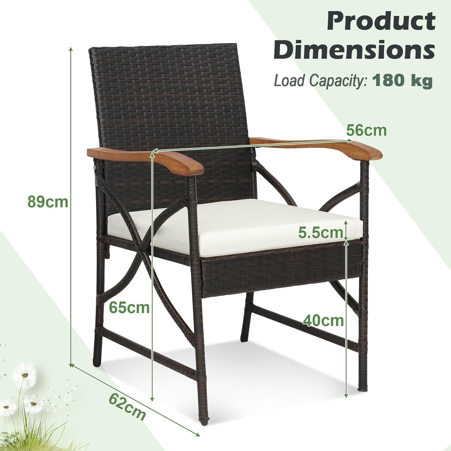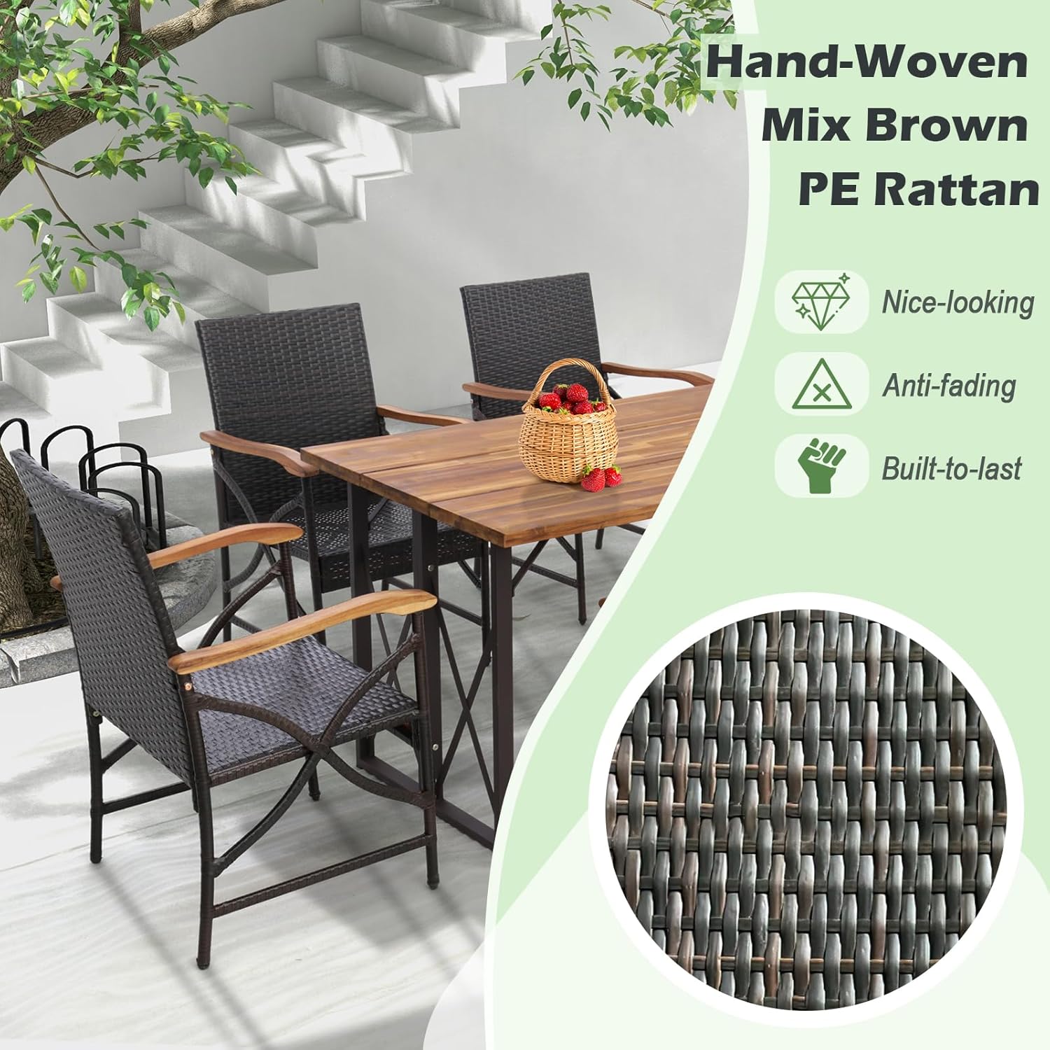 - Chaise en Rotin Durable : Fabriquées en rotin PE brun tressé à la main, ces chaises allient esthétique et longévité. Grâce à leur excellente résistance aux intempéries et à la décoloration, elles conviennent à un usage extérieur de longue durée.