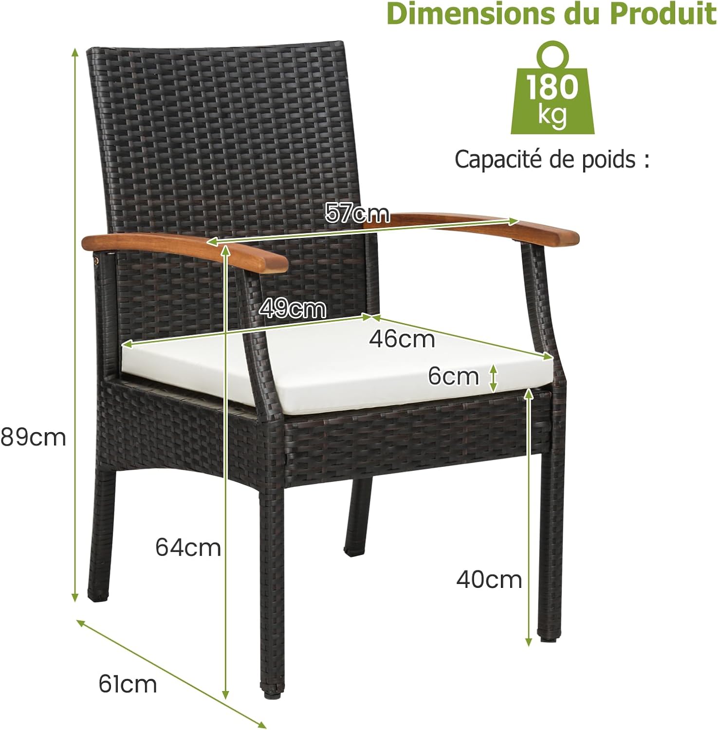 Êtes-vous toujours à la recherche de chaises de salle à manger confortables ? Vous pouvez considérer notre ensemble de 2 chaises en rotin ! Le rotin PE de qualité assure une bonne résistance aux intempéries et rend le siège plus respirant. La conception ergonomique avec des dossiers hauts, les larges accoudoirs en bois d'acacia et les coussins avec rembourrage d'éponge est conçu pour que tout soit fait pour qu’on s’y sente bien. En outre, le poids maximum supporté par la chaise peut aller jusqu’à 180 kg, vous pouvez donc l’utiliser en toute confiance. N’hésitez pas à l’acheter !