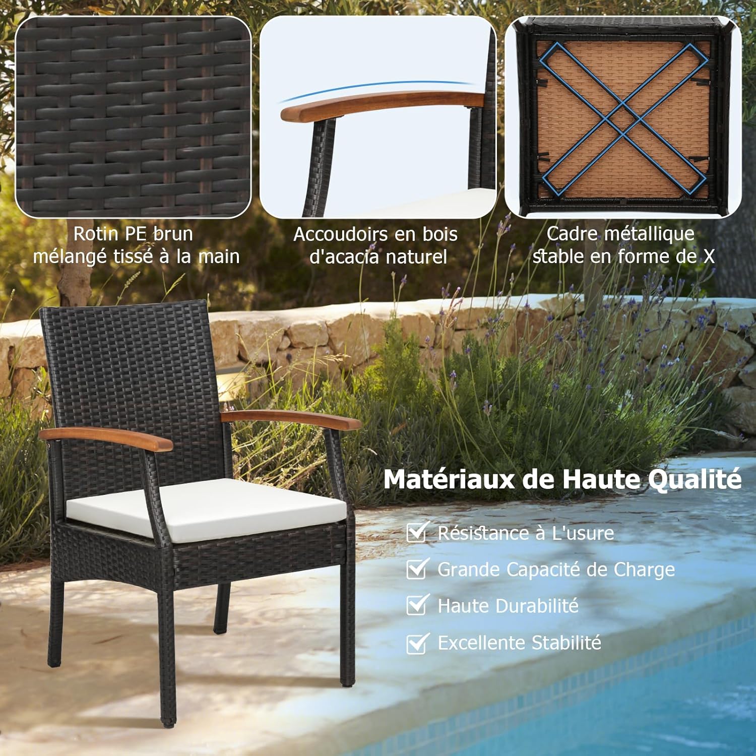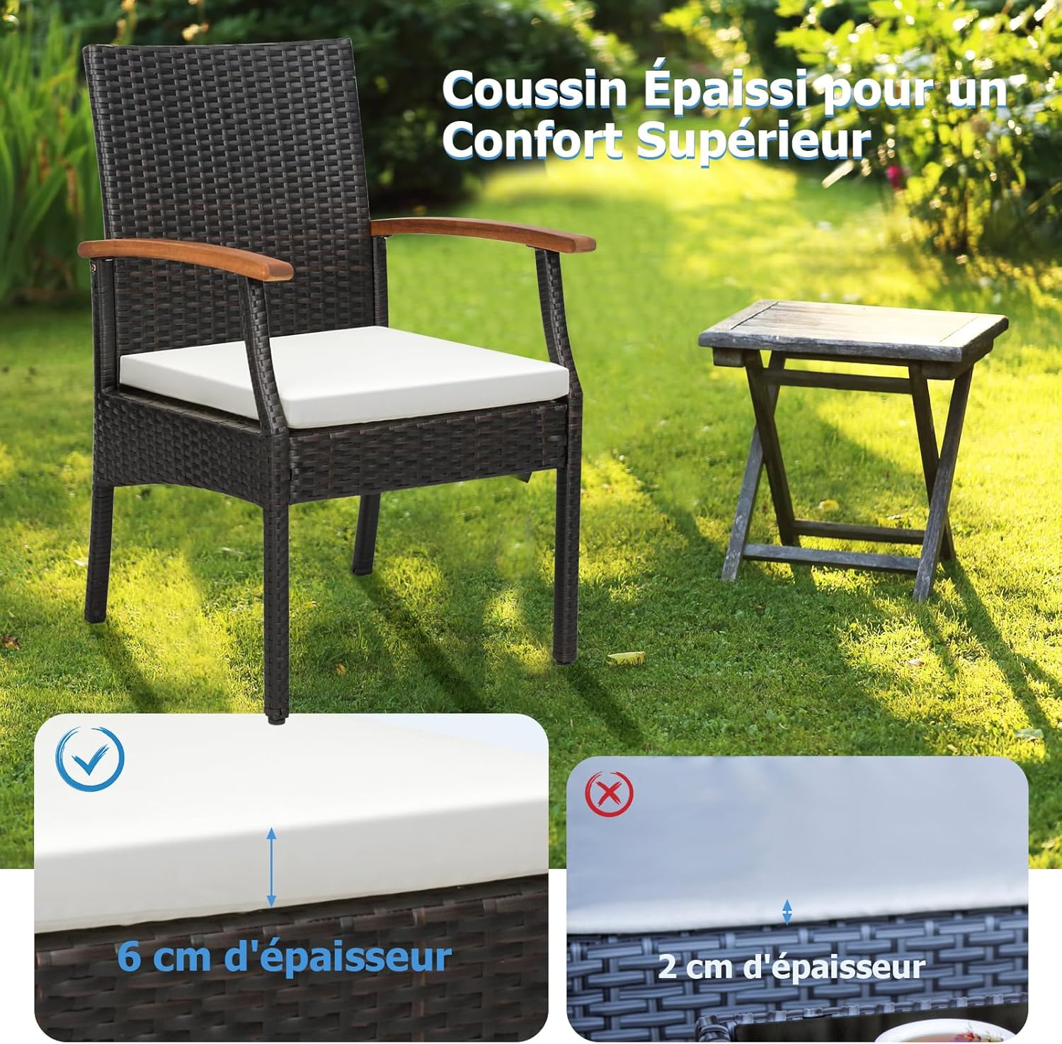 Matériau : Rotin PE, Métal, Tissu Polyester, Éponge, Bois d'Acacia