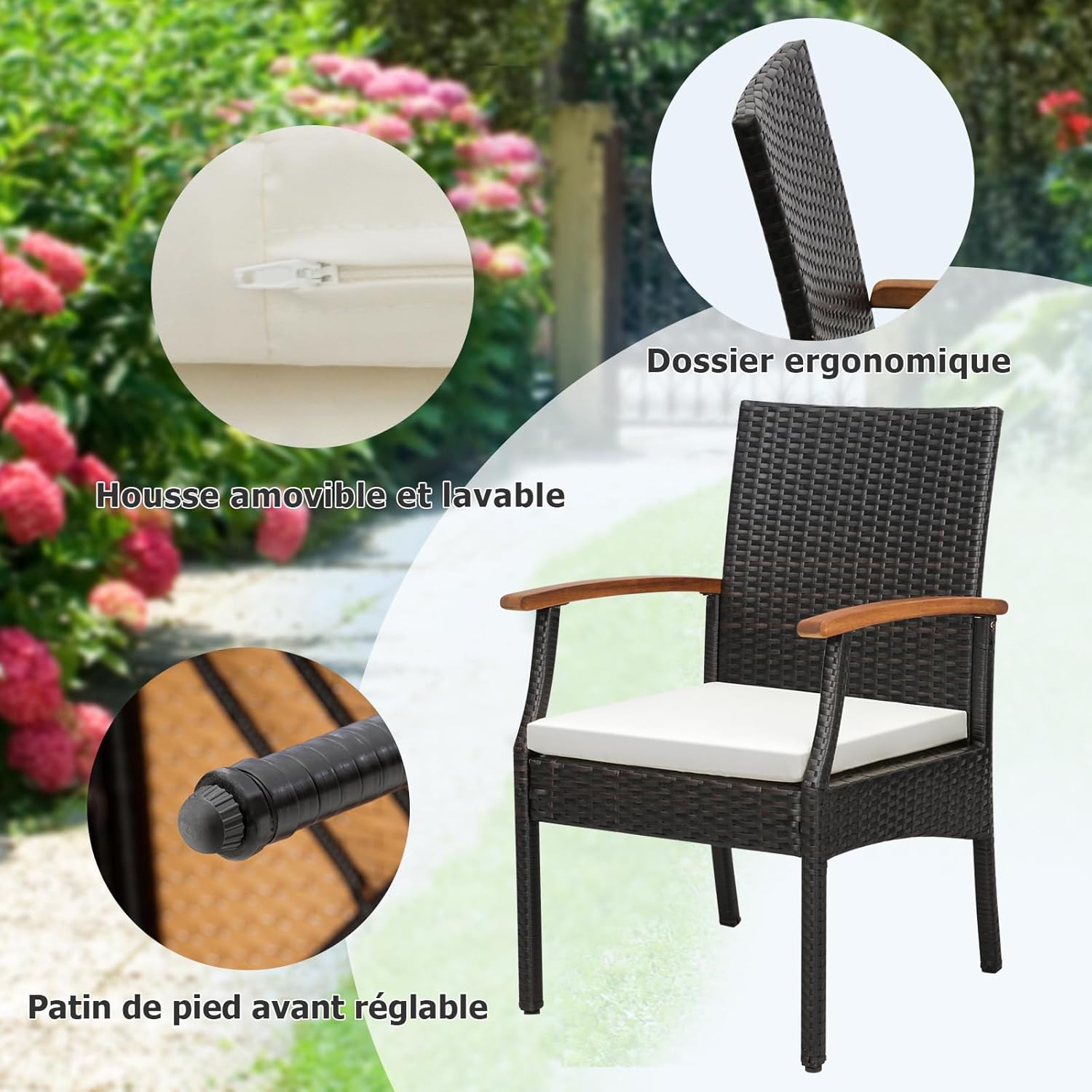 - Chaises Confortables : Les chaises sont équipées de dossiers et de coussins rembourrés qui renforcent le confort. Le design du dossier ergonomique soulage les maux de dos. En outre, les longs accoudoirs en bois d'acacia soutiennent bien les bras.
