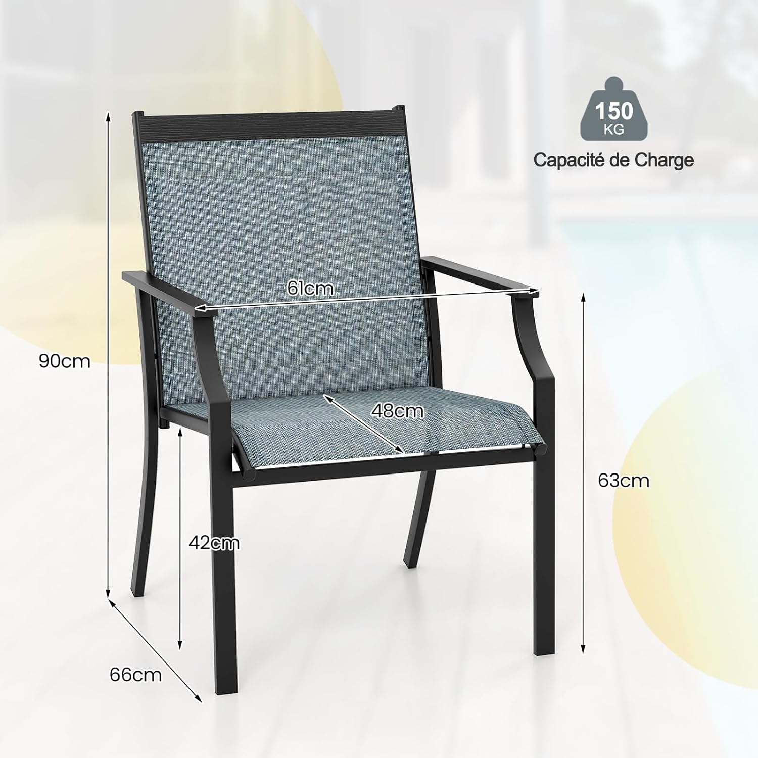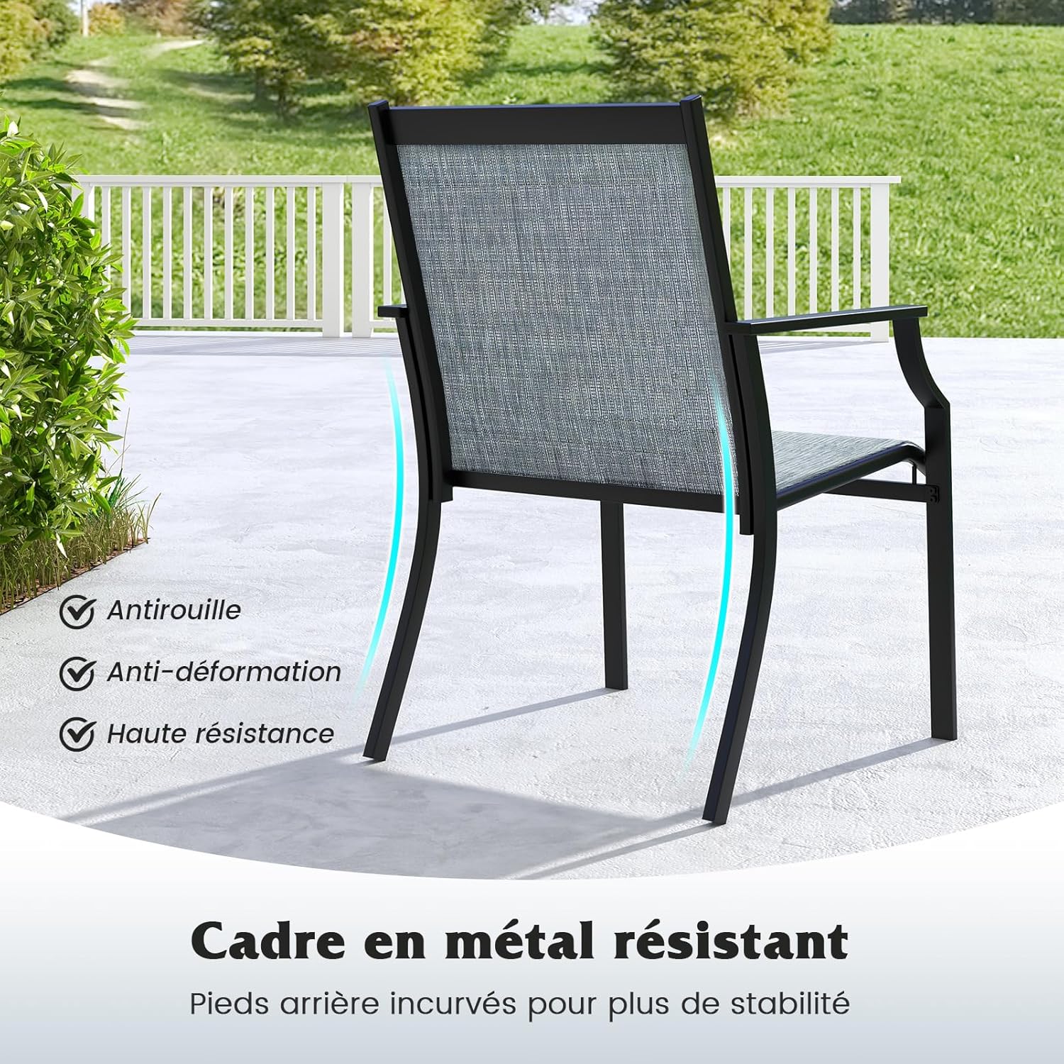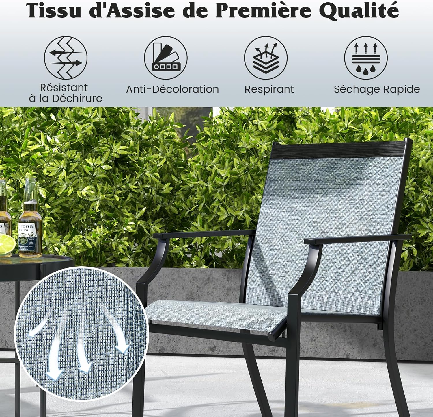 Transformez votre jardin en un espace extérieur confortable avec cet ensemble de 2 chaises de salle à manger toutes saisons. Fabriquées en tissu anti-usure avec une structure en métal robuste, elles vous serviront longtemps. Le tissu respirant et à séchage rapide vous évite d'avoir chaud l’été. Le siège large, le dossier haut ergonomique et les accoudoirs vous offrent un excellent soutien, vous permettant de vous asseoir confortablement. Chaque chaise assure une capacité de charge de 150 kg et vous pouvez simplement les placer dans n'importe quel environnement intérieur ou extérieur !