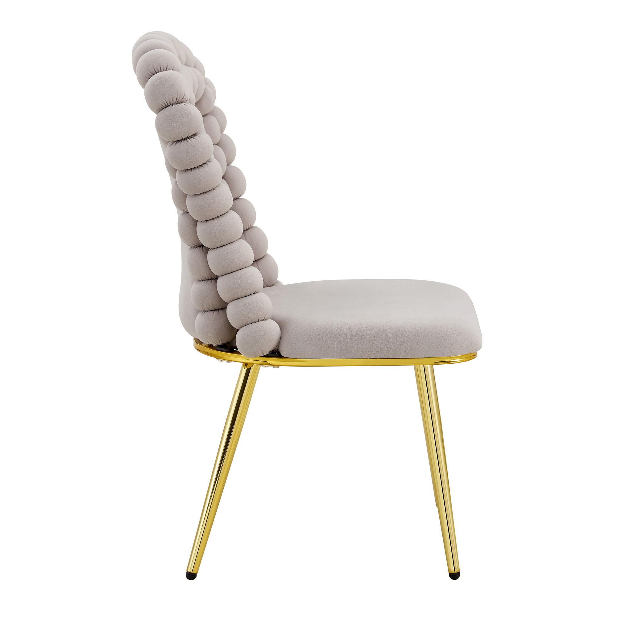Lot de 2 chaises velours gris clair, dossier chaîne de boules, piètement métal doré