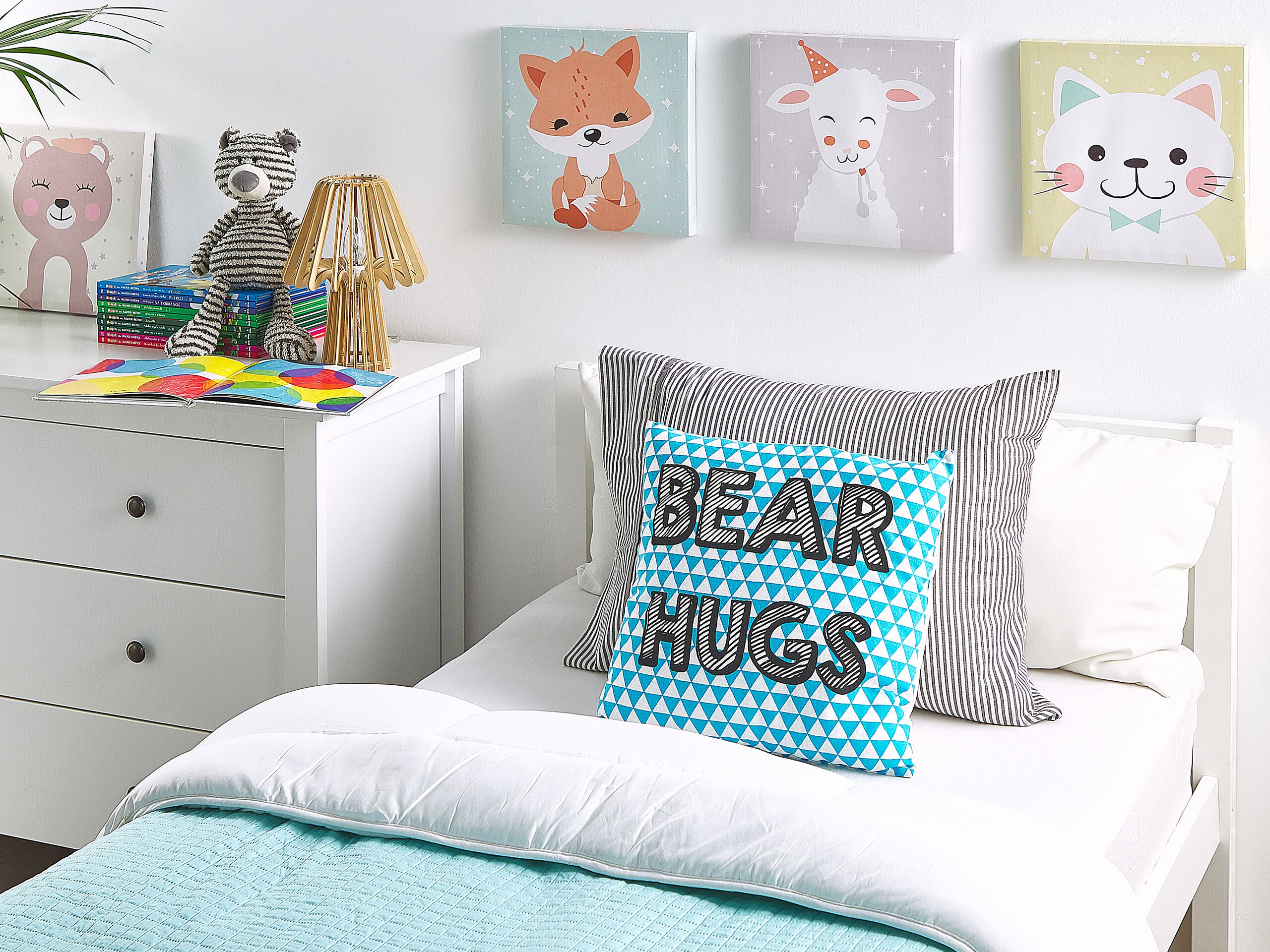 2 coussins décoratifs bleus de style scandinave avec texte. Il est parfois difficile de décorer une chambre d'enfant, la décoration doit être solide et non dangereuse. C'est pourquoi ces coussins en tissu souple et en coton naturel sont idéals. Votre enfant sera séduit par leur imprimé coloré qui apportera de l'énergie et de la bonne humeur dans votre pièce.