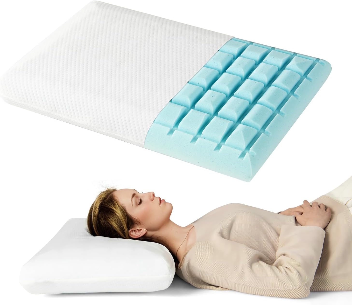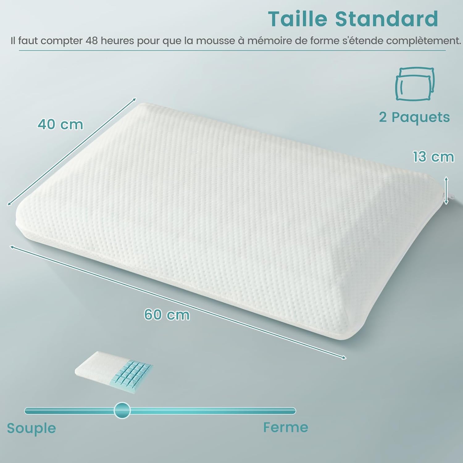 - 2 coussins en mousse à mémoire de forme. Ce coussin en mousse à mémoire de forme avec gel rafraîchissant aide à prévenir la surchauffe et garantit une nuit de sommeil plus réparatrice. Le design ventilé améliore également le flux d'air, vous gardant au frais et confortable toute la nuit.
