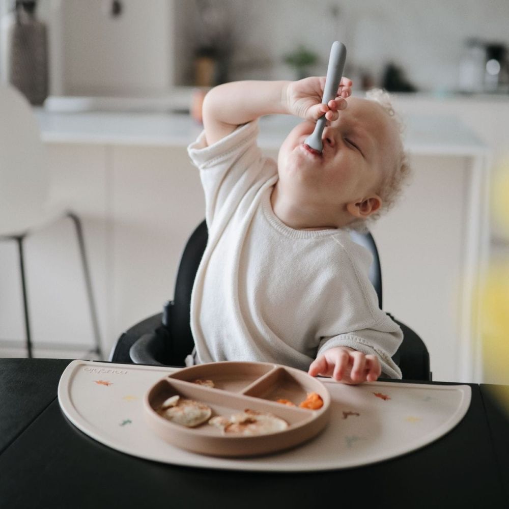 Fabriqué avec du silicone 100% alimentaire 100% sans BPA, BPS, PVC et phtalates La cuillère en silicone mesure 6,25" de long (15,87 cm) Recommandé pour les 6 mois et plus Fabriqué en Chine Entretien recommandé