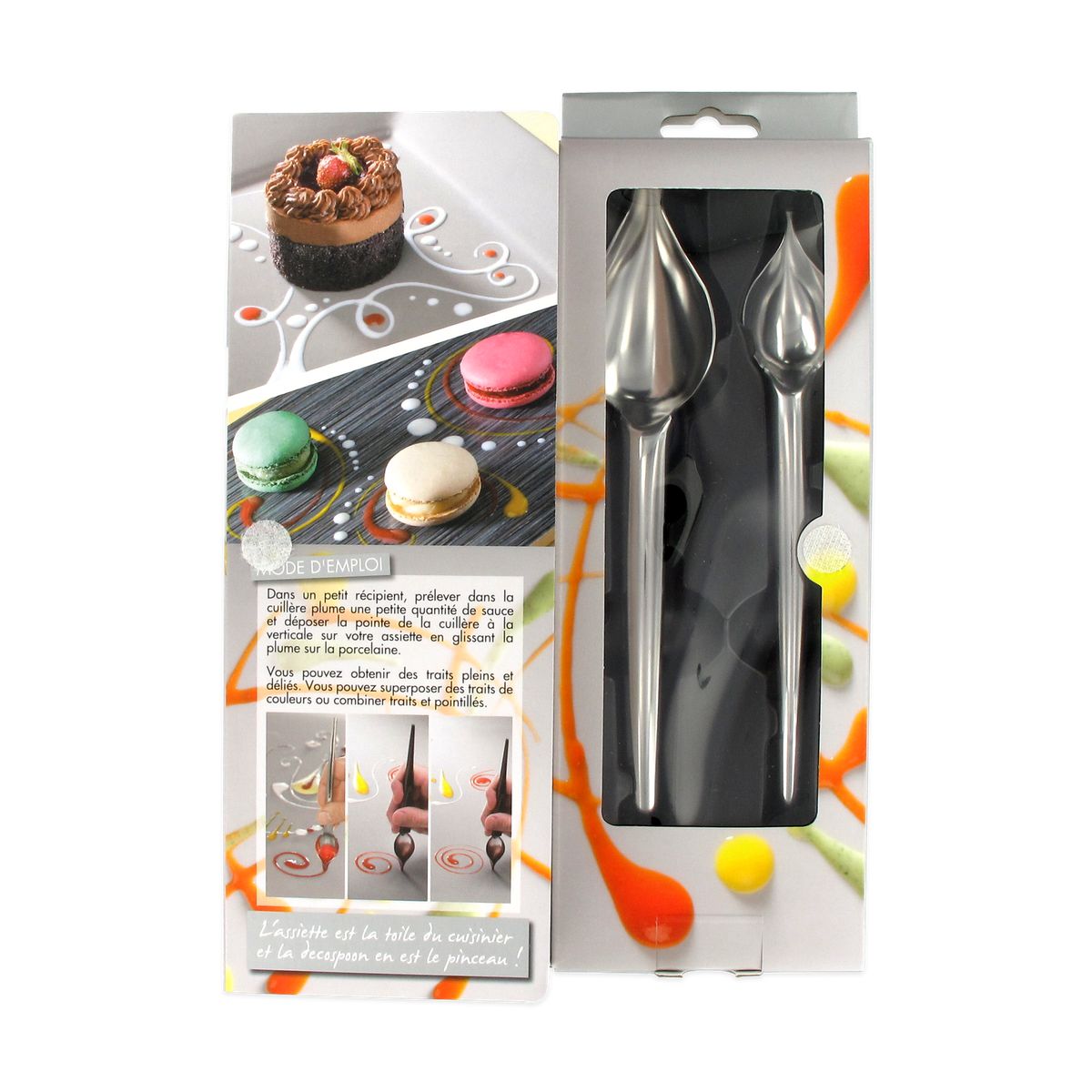| Plus produit | MODE D'EMPLOI : Trempez votre cuillère plume dans le liquide souhaité, déposez la pointe de la cuillère sur l'assiette délicatement puis étalez selon le motif voulu ; la bonne pratique de la cuillère plume nécessite un peu d'entraînement, ne vous découragez pas |