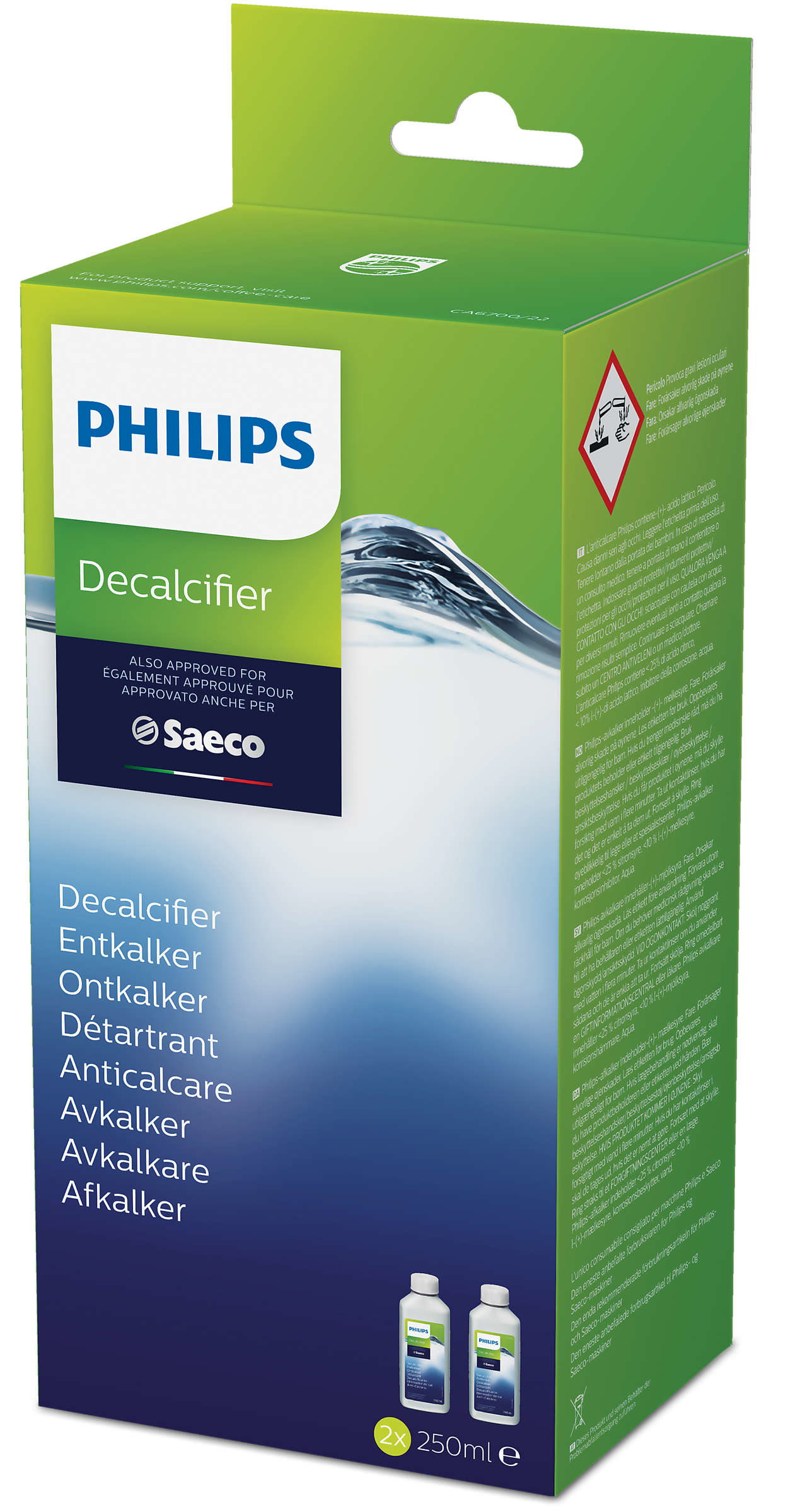 ca6700/22 - lot de 2 détartrants pour expresso - Lot de 2 détartrants Philips CA6700/22 spécial machine espresso pour amélioré le goût du café.Éliminez le calcaire et prolongez la durée de vie de la machineIl est essentiel de détartrer régulièrement votre machine espresso pour qu'elle maintienne un fonctionnement optimal et puisse préparer un excellent café à tout moment. Le détartrant spécial machine espresso élimine le calcaire de votre machine.Détartrage parfaitLe détartrant Philips nettoie tous les circuits d'eau de votre machine espresso.Protection contre le calcaireLe calcaire se trouve naturellement dans l'eau utilisée par la machine. Ce détartrant spécial évite que du calcaire ne s'accumule dans votre appareil, car cela aurait un effet négatif sur ses performances et sur le goût du café. Il est très efficace, sûr et facile à utiliser.Détartrage approuvé par PhilipsLa formule exclusive du détartrant pour machine espresso Philips assure un détartrage efficace, mais qui n'abîme pas les pièces fragiles à l'intérieur de l'appareil.Préservez les saveurs du caféL'entretien régulier de votre machine espresso Philips Saeco permet de préserver les arômes et les saveurs.La bonne température de caféLe détartrant élimine les résidus de calcaire dans le circuit d'eau, ce qui évite qu'ils n'absorbent la chaleur produite par la chaudière, réduisant ainsi la température du café.Philips OriginalUtilisez uniquement des consommables Philips pour être sûr que votre machine fonctionne plus longtemps de manière optimale. Les consommables Philips sont les seuls recommandés pour les machines Philips et Saeco. - Type : Détartrant.