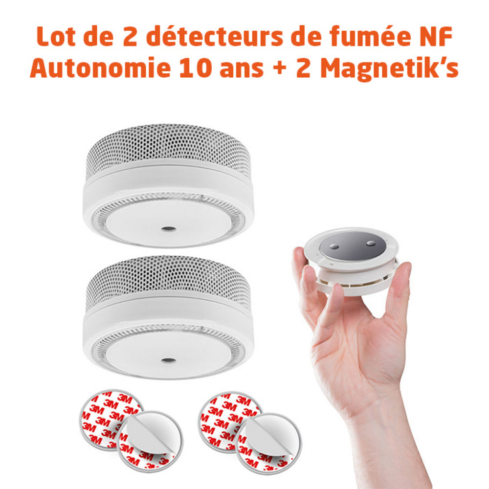 Lot de 2 détecteurs de fumée NF autonomie 10 ans + supports magnétiques