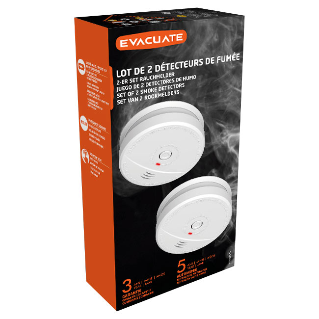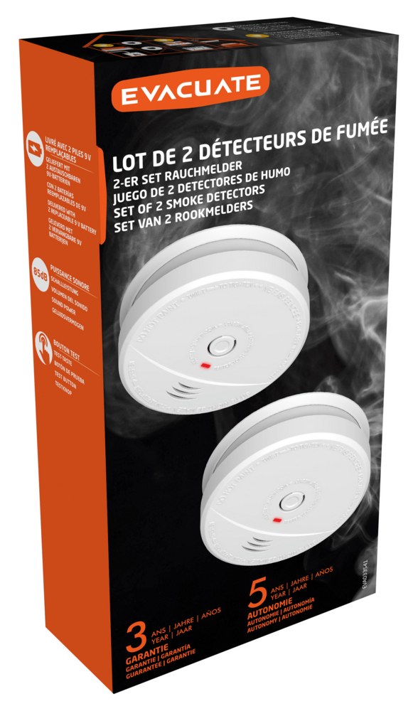 Lot de 2 détecteurs de fumée (livré avec pile), muni d'un capteur optique, est destiné à être installé dns des immeubles d'habitation, des appartements et des pièces à usage résidentiel. Les détecteurs de fumée et d'incendie, sont conçus pour avertir rapidement de la présence de fumée et d'incendie, afin de pouvoir réagir de manière adéquate face à cet évènement dangereux. Veuillez toujours consulter les réglementations en vigueur en matière d'avertisseur de fumée.