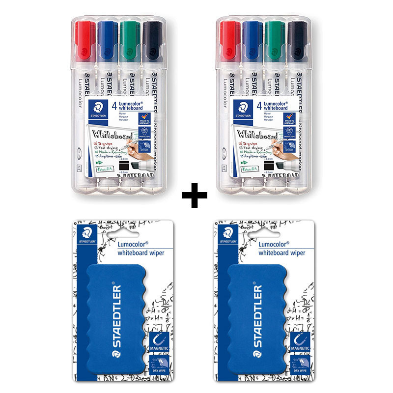 Lot de 2 étuis de 4 marqueurs biseauté Lumocolor pour tableau blanc + 2 brosses magnétique Staedtler