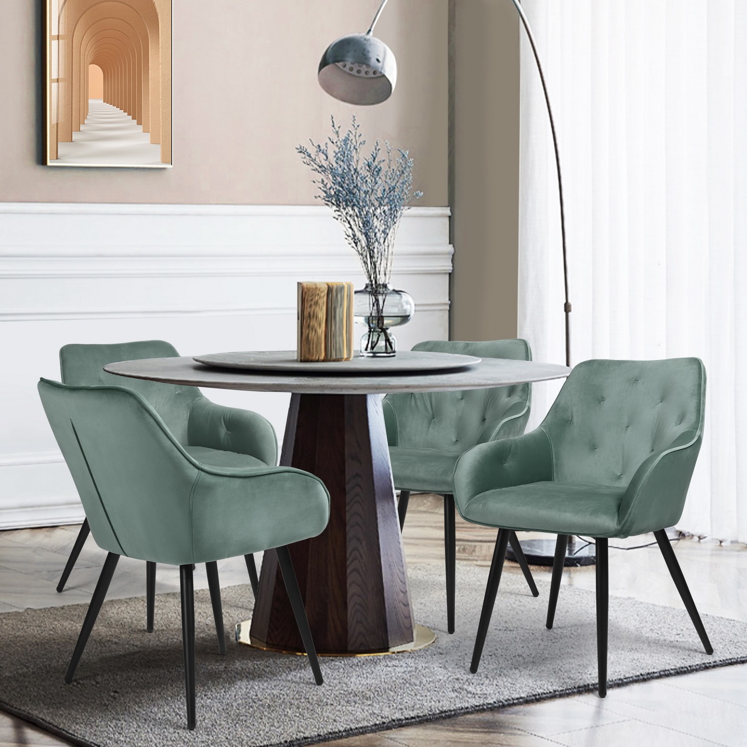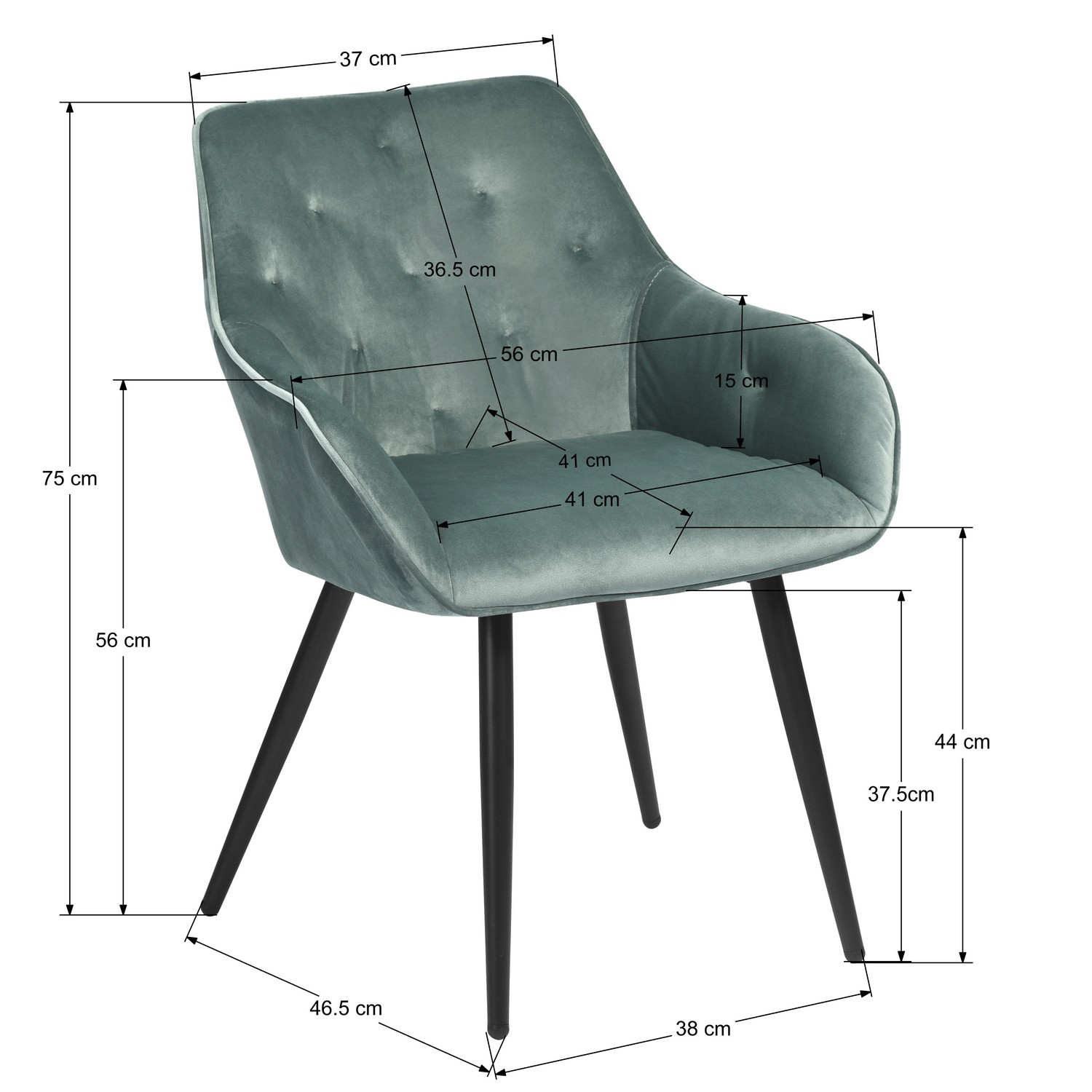 Lot de 2 Fauteuils Chaises avec accoudoirs - Style scandinave -Velours vert et Pieds Métal Noir Notre fauteuil CHANDLER est une pièce maîtresse très belle et élégante. C'est le fauteuil dont vous tombez amoureux au premier regard. Son velours est doux, épais et luxueux, très délicat au toucher et n'irrite pas les personnes à la peau sensible. Le design de la couleur est aussi une idée qui sort de l'ordinaire. En voyant la chaise, vous vous sentirez très à l'aise. Bien sûr, notre fauteuil CHANDLER n'a pas seulement l'air confortable, mais il vous procurera également une expérience extraordinaire lorsque vous vous asseyez dessus. Caractéristiques: - Assise velours pied métal, - Fabrication de haute qualité, style moderne et scandinave - Conception stable, solide et confortable - Convient pour : cuisine, chambre, couloir, salle à manger, salon, couloir séjour Informations de base: - Taille du produit: 56*59*75 cm - Taille d'emballage: 56*53*67 cm - Emballage: 2PC/1CTN - Poids brut : 13,5 KG - Poids net : 11,2 KG