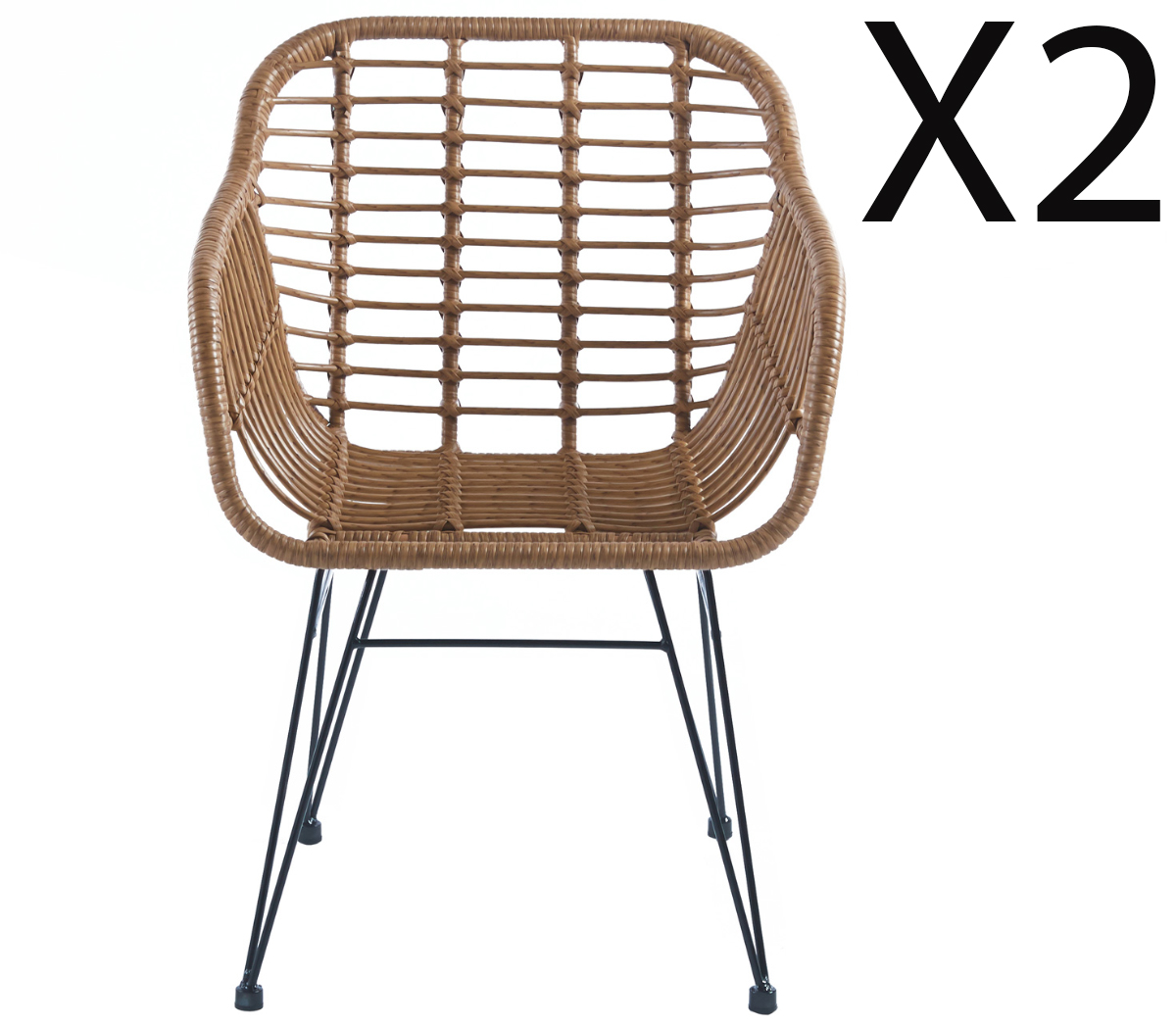 Lot de 2 fauteuils de jardin en imitation rotin coloris naturel avec traitement anti UV. Pour usage intérieur/extérieur. Pieds en métal noir. Dimensions : Longueur 56 x profondeur 61 x hauteur 82 cm Matière : imitation rotin, métal Coloris : naturel, noir Poids : 15 kg