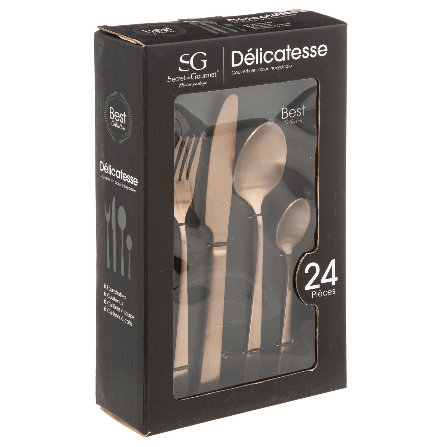 - Kit de 48 pièces contenant 12 couteaux, 12 fourchettes, 12 cuillères et 12 cuillères à café.