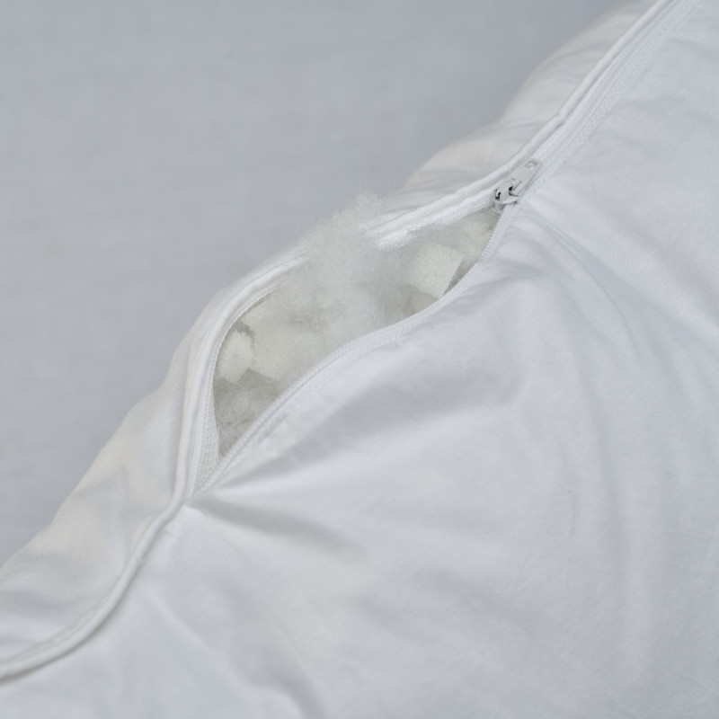 - Garnissage 50% polyester siliconé creux + 50% copeaux de mousse viscoélastique à mémoire de forme