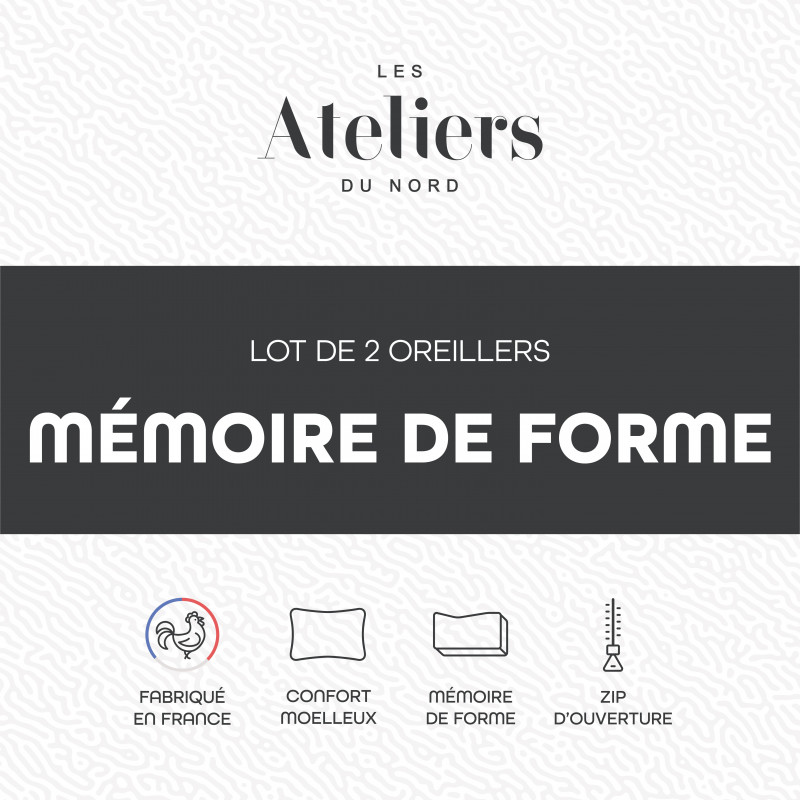 Profitez d'un maximum de confort à prix tout doux, avec le lot de 2 Oreillers Mémoire de forme Ateliers du Nord. Ces oreillers carrés 60x 60 cm sont fabriqués en France. Ils bénéficient d'un garnissage mixte 50% polyester siliconé creux + 50% copeaux de mousse viscoélastique à mémoire de forme qui épouse bien les formes de la tête et de la nuque pour vous assurer soutien optimal. Leur enveloppe douce et respirante 100% coton qualité percale est dotée d'un zip qui vous permet d'accéder au garnissage et d'ajuster le volume de chaque oreiller afin de profiter d'un confort sur mesure.