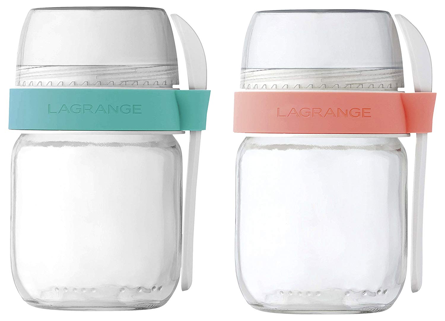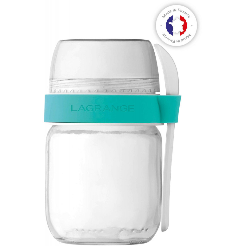 440402 - lot de 2 pots en verre pour yaourtière - Lot de 2 pots en verre compartimentés Lagrange 440402 pour yaourts à emporter avec petite cuillère incluse.Pratique : pots en verre compartimentés vendus par lot de 2 et pouvant contenir des graines, muesli, sirop, compote ou encore du miel. Ces yaourts s'emportent hors du domicile pour se consommer en en-cas en mélangeant le contenant des pots compartimentés au yaourt. Une petite cuillère est fournie pour permettre de consommer ces yaourts agrémentés.Adaptable : les 2 pots en verre sont compatibles avec les autres pots à yaourt Lagrange et peuvent se nettoyer au lave-vaisselle ou à la main.3 références disponibles : bagues siliconées Citron&Céleste (jaune et bleu) - référence 440 401, bagues siliconées Pamplemousse&Chlorophylle (corail et vert) - référence 440 402 et bagues siliconées Praline rose&Curacao (rose et bleu ciel) - référence 440 403.