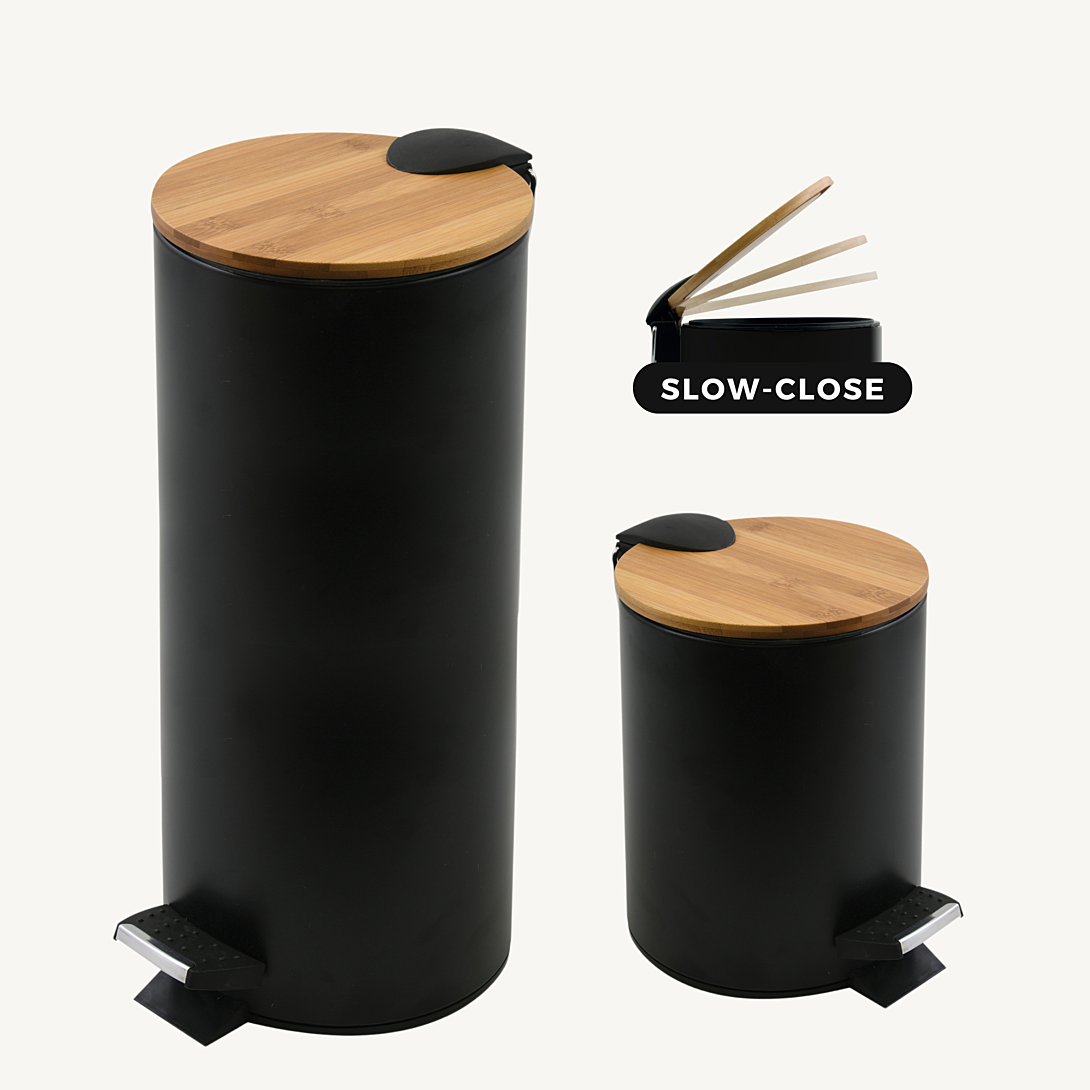 Les 2 poubelles sont équipées d'un mécanisme à pédale avec une fermeture lente et silencieuse. Le seau intérieur est amovible pour faciliter le vidage et le nettoyage Couvercle en bois