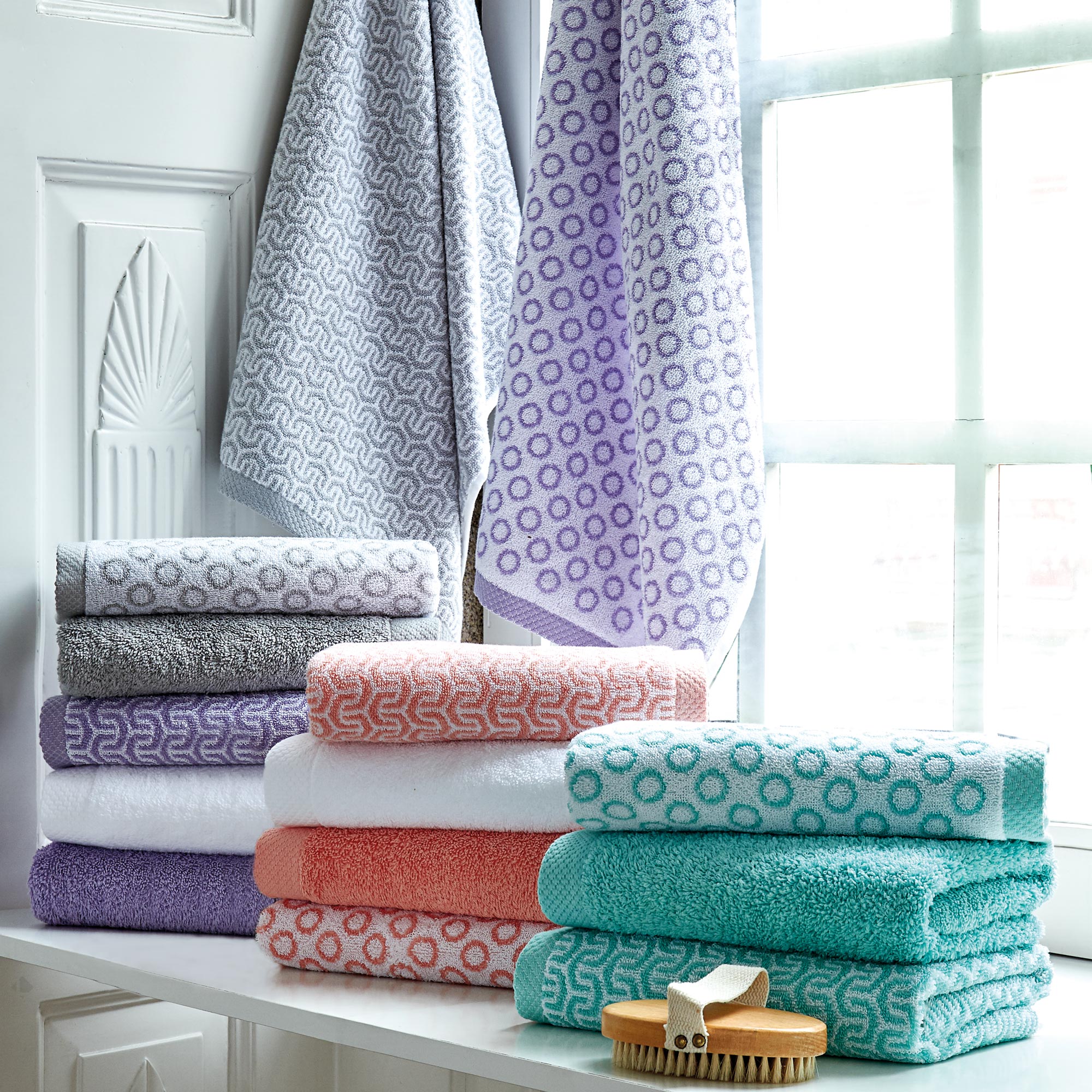 - Collection GRAPHIC CIRCLE disponible en drap de bain 100x150 cm, drap de douche 70x140 cm, serviette de toilette 50x100 cm, serviette invité 33x50 cm et gant de toilette 16x21 cm, Articles vendus séparement ou en parure.