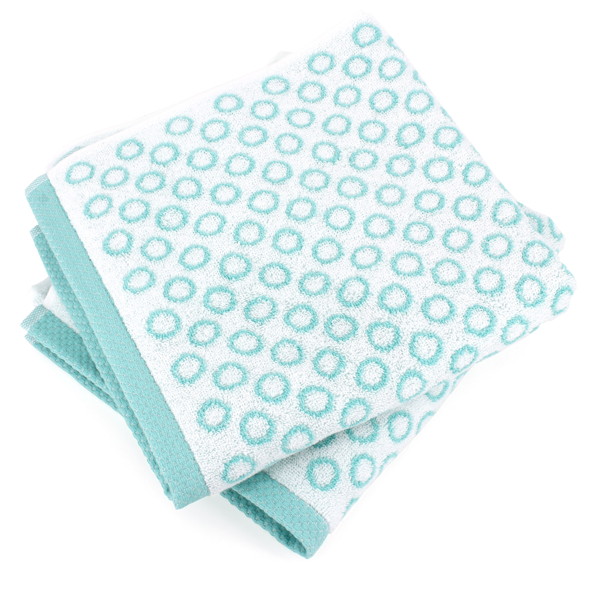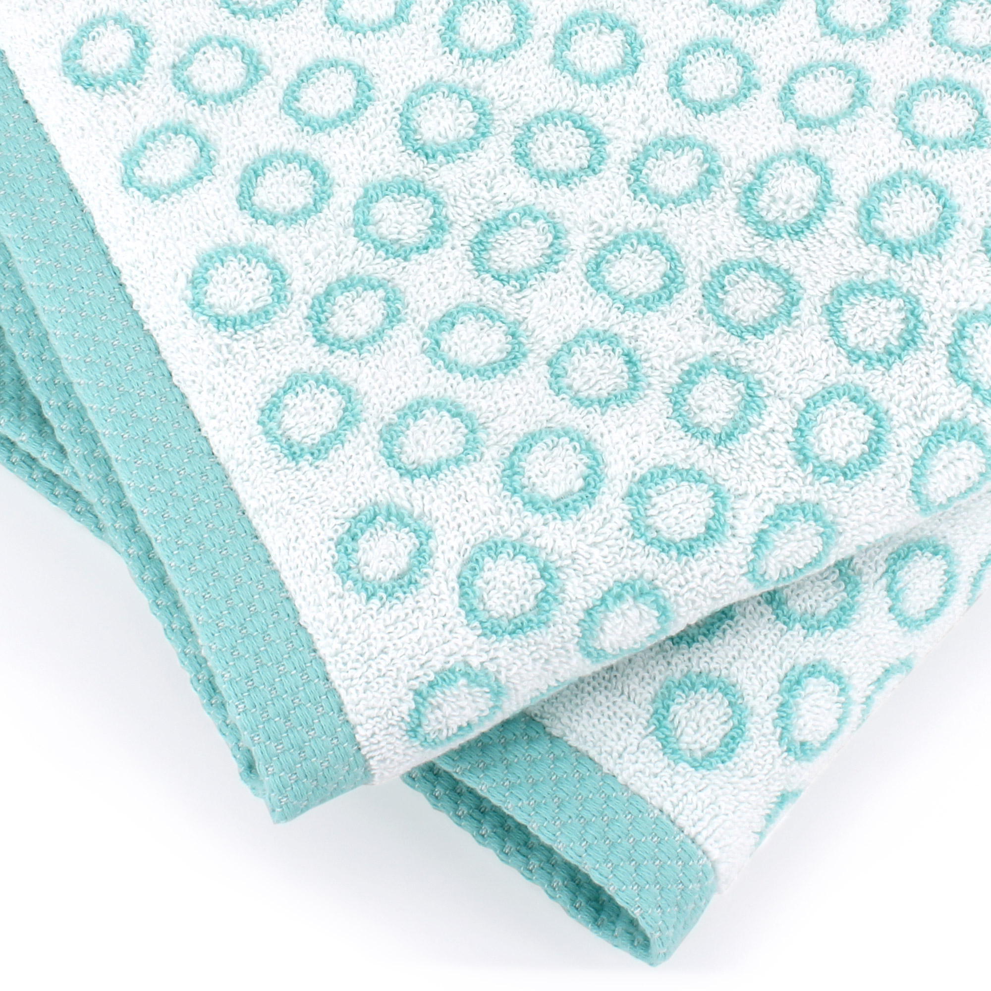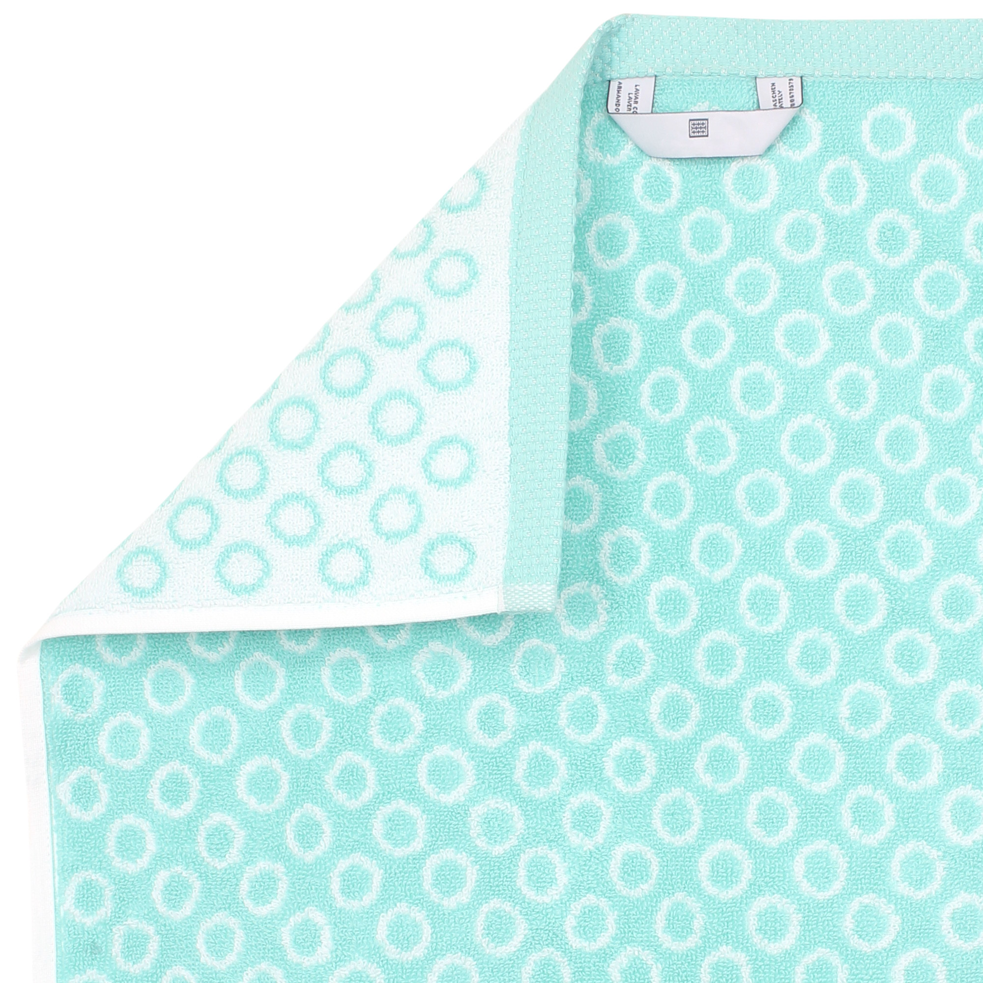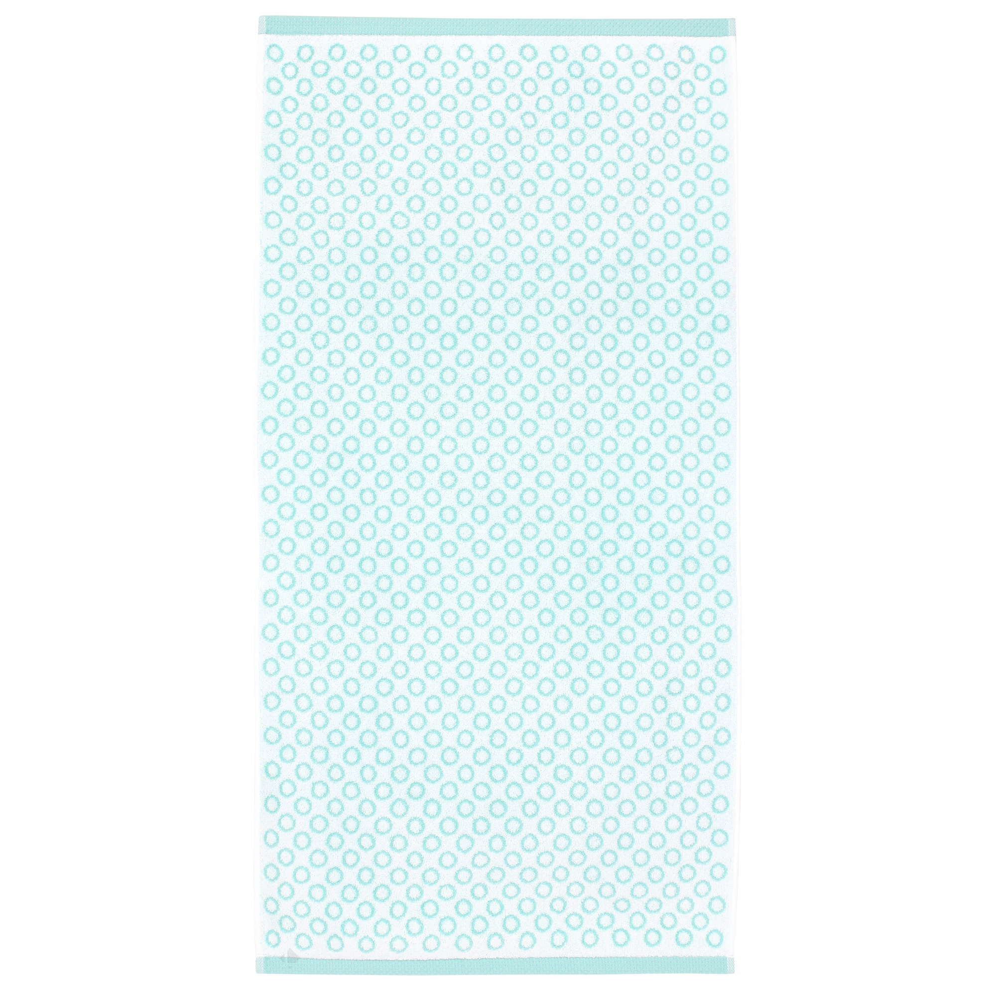 | Plus produit | Serviette de toilette éponge 50x100 cm GRAPHIC CIRCLE Linge de bain avec des motifs ronds qui se repète dans une ambiance bleu turquoise et blanc avec finition liteau jacquard. |