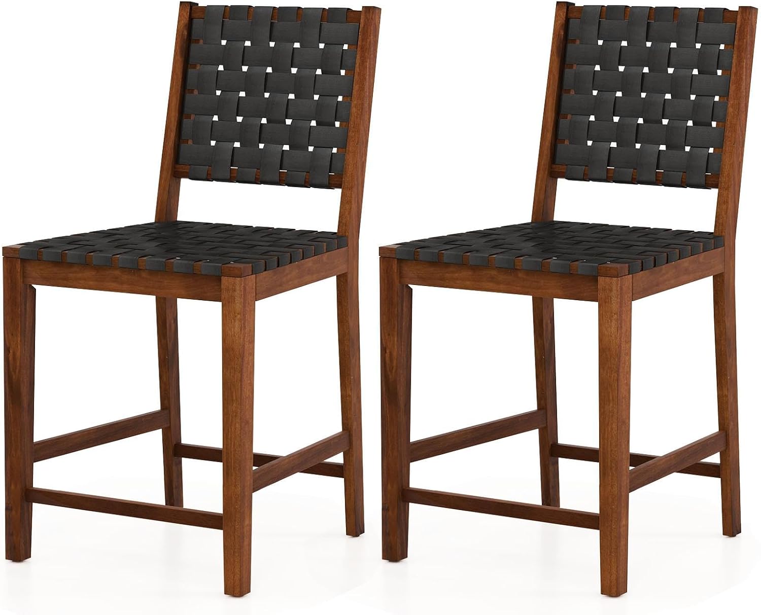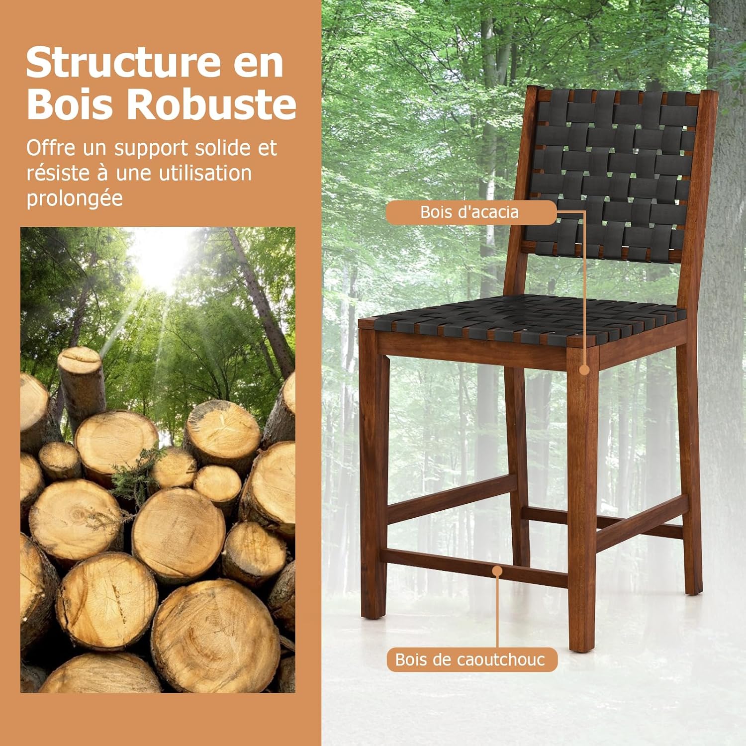 Lot de 2 tabourets de bar, sans bras, avec dossier tressé, repose-pieds confortable, cadre en bois massif