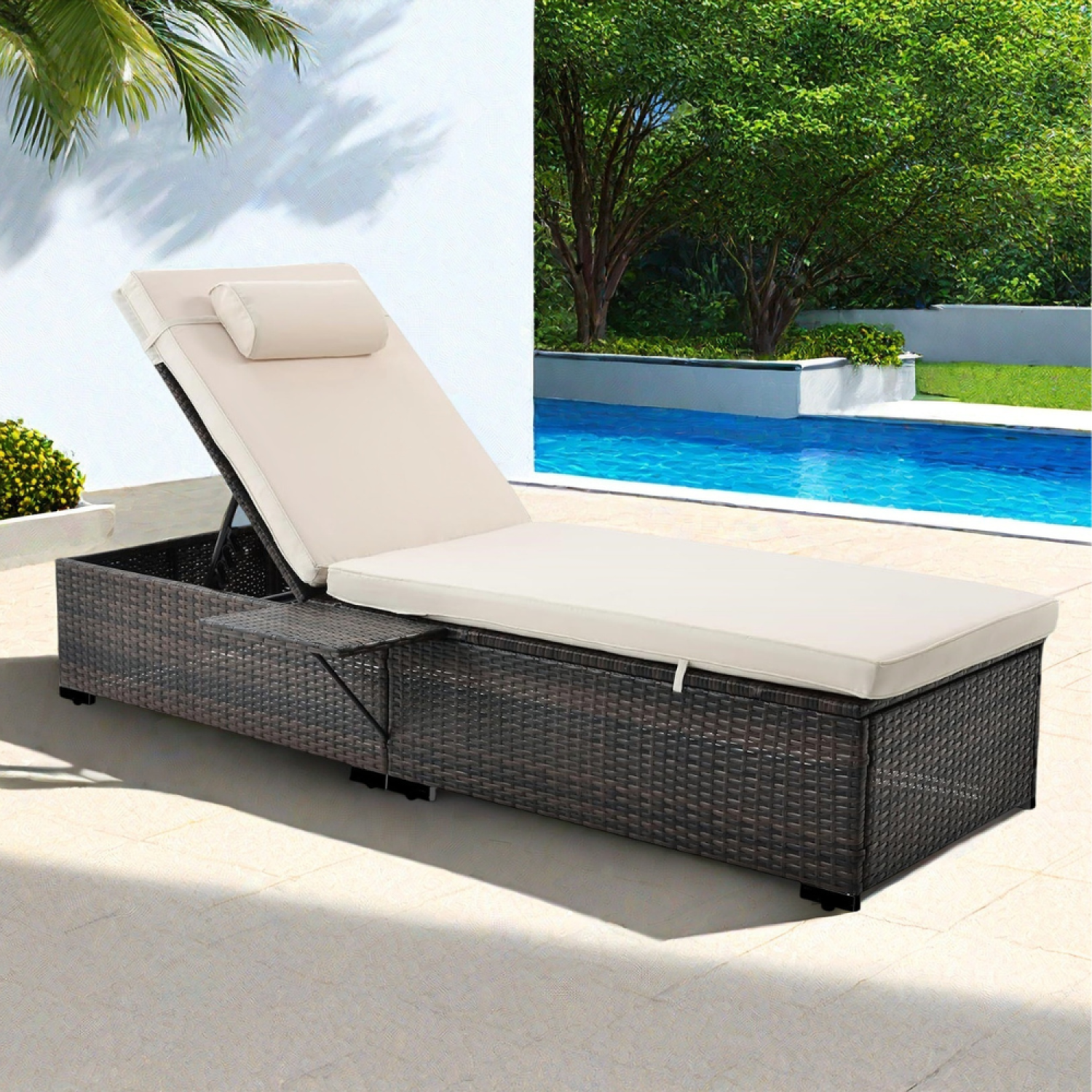 Lot de 2 transats coussins beige en résine tressée avec tablette latérale