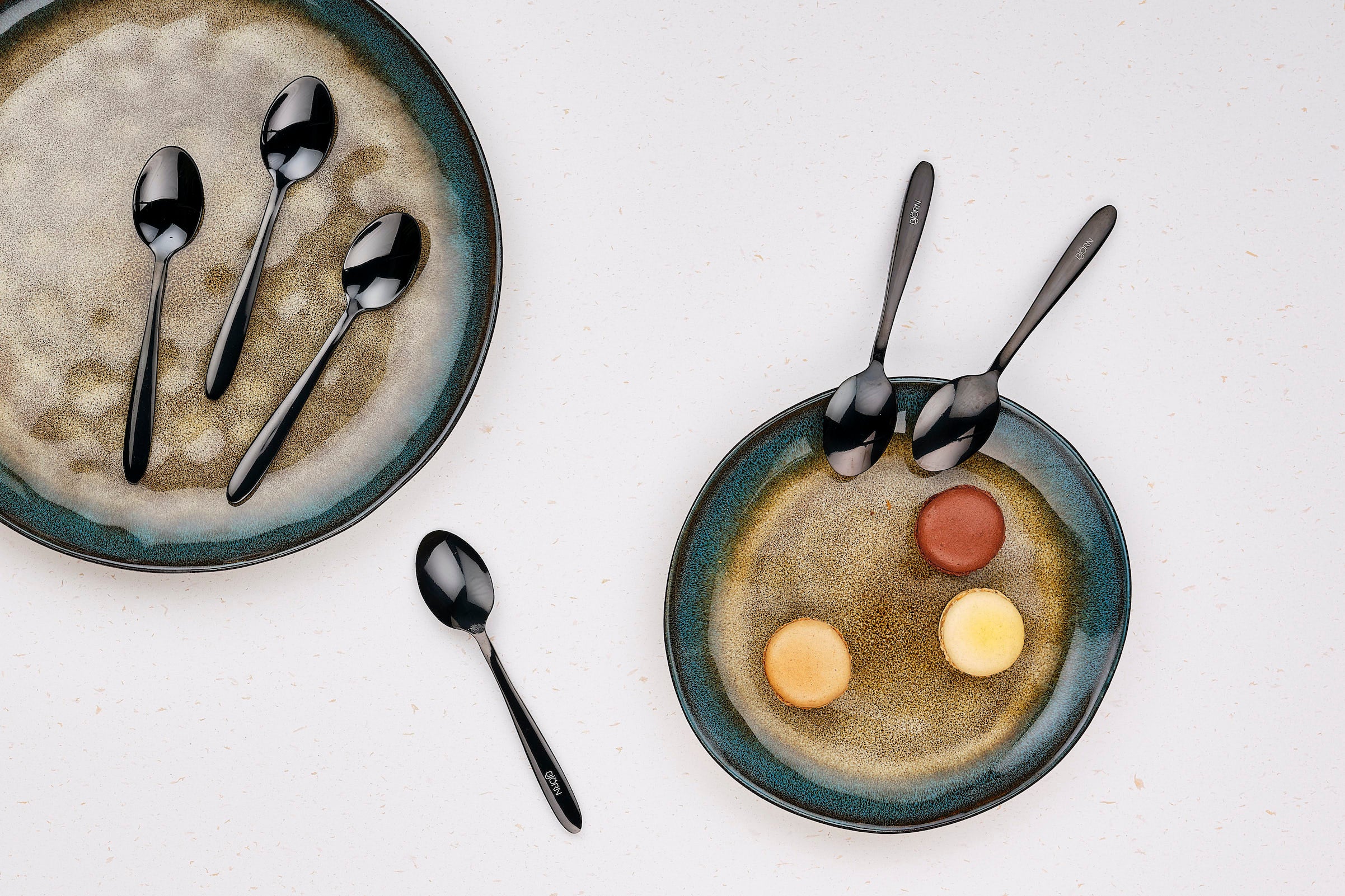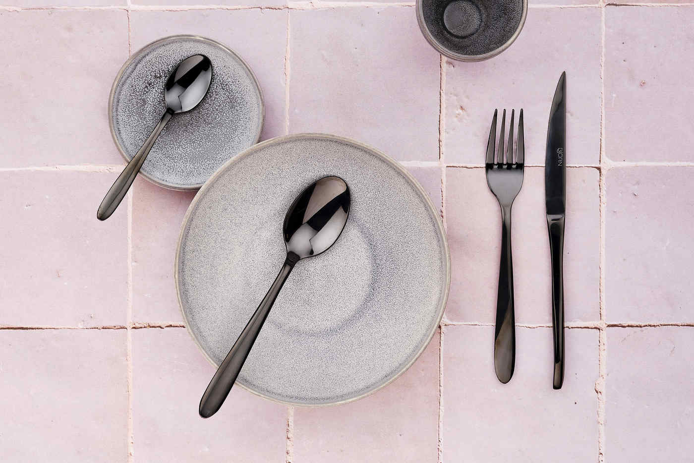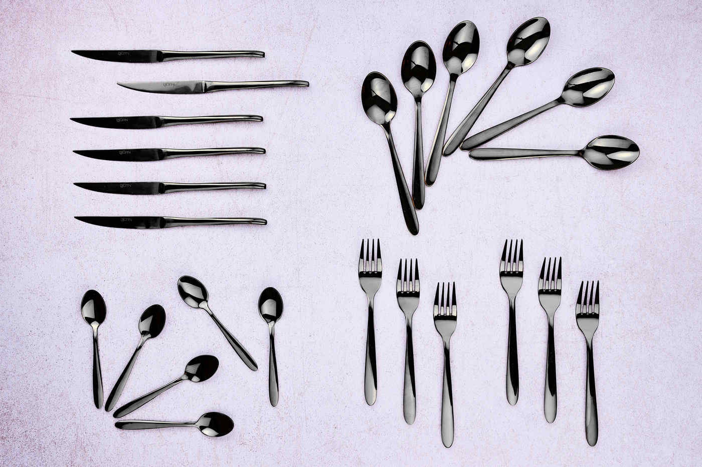 Fabriqué en acier inoxydable pour résister à une utilisation quotidienne, ces couverts sont durables et d'un entretien facile au lave-vaisselle. Dans sa version de couleur noire avec une finition brillante, ce modèle à l'effet miroir chic et éclatant illuminera votre table et étonnera vos convives.