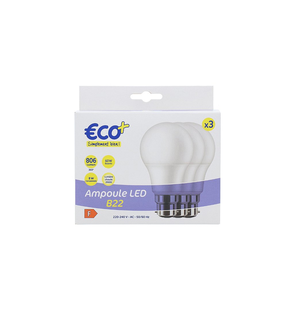 | Libellé | Lot de 3 ampoules LED standard opaque B22 60W lumière chaude - Eco+ |